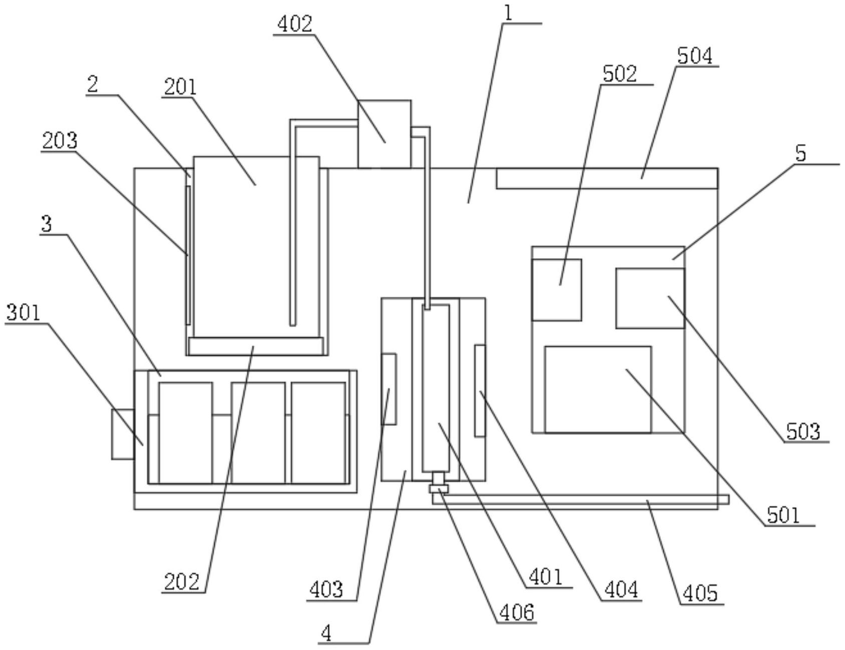 本实用新型涉及食品检测技术领域,尤其为一种南北干货果蔬微生物检测装置,包括机壳,机壳左端顶部设置有预处理槽,机壳内部于预处理槽右侧依次设置有检测室和控制室,检测装置还包括设置在预处理槽内的预处理机构、设置在检测室内的检测机构和设置在控制室内的控制机构。本实用新型中,通过在预处理槽内设置磁力搅拌器,可对样品杯内的样品进行磁力搅拌,期间,从检测试剂抽屉中取出对应的检测试剂添加,得到待检测样品,利用供料泵将待检测样品抽入检测玻璃箱内,同时开启光源,利用颜色传感器对待检测样品进行检测,检测结果由处理器芯片处理,该装置,可实现对南北干货果蔬微生物的快速检测,操作方便,适宜推广使用。