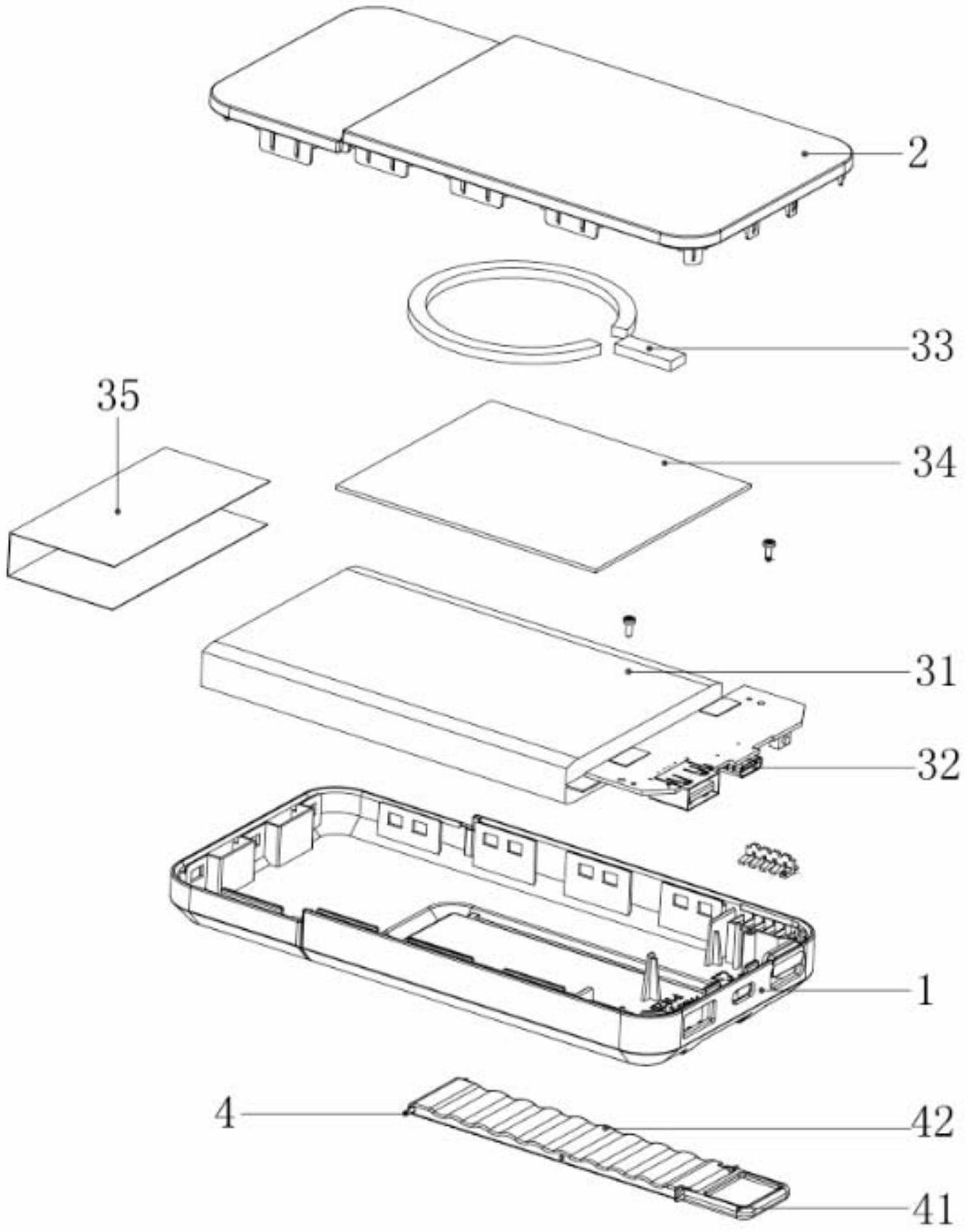 本实用新型公开一种搭载便捷式手机支架结构的移动电源,包括:主壳、扣合于主壳上的底壳、放置于主壳内部的电芯、与电芯连接的PCBA、设置于主壳上的支架安装槽、铰接于支架安装槽上的柔性支架、铰接于柔性支架一端的支架扣、以及设置于底壳内侧的磁组,安装槽上设置有若干定位骨,支架扣上设置有扣合槽,支架扣通过扣合槽扣合于定位骨上。本实用新型通过改变支架扣所扣合的定位骨的位置,使得柔性支架弯曲凸起,以便于为移动电源提供支撑,并且通过磁组的磁性对手机等电子产品进行吸附,从而实现电子产品的放置固定,满足手机支架功能的使用需求,同时便于收纳及携带。