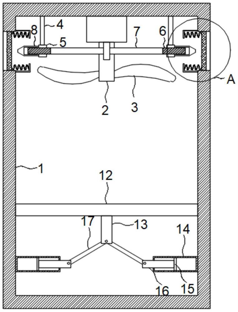 本实用新型公开了一种大数据服务器散热装置,包括壳体,所述壳体内设有电机,所述电机输出端固定连接有蜗杆,所述壳体上对称滑动连接有连接杆,所述连接杆上固定连接有往复丝杠套,所述往复丝杠套上固定连接有抵杆,所述往复丝杠套上螺纹连接有往复丝杠,两个所述往复丝杠之间固定连接有转轴,所述转轴上固定连接有蜗轮,所述壳体上对称设有散热口,所述散热口内壁上滑动连接有滤网,所述壳体内对称固定连接有四块L形挡板,所述L形挡板内壁与滤网之间固定连接有弹簧。本实用新型时启动电机,蜗杆转动带动蜗轮转动,带动抵杆左右运动,使得滤网左右运动产生震动,将滤网上的灰尘震落。