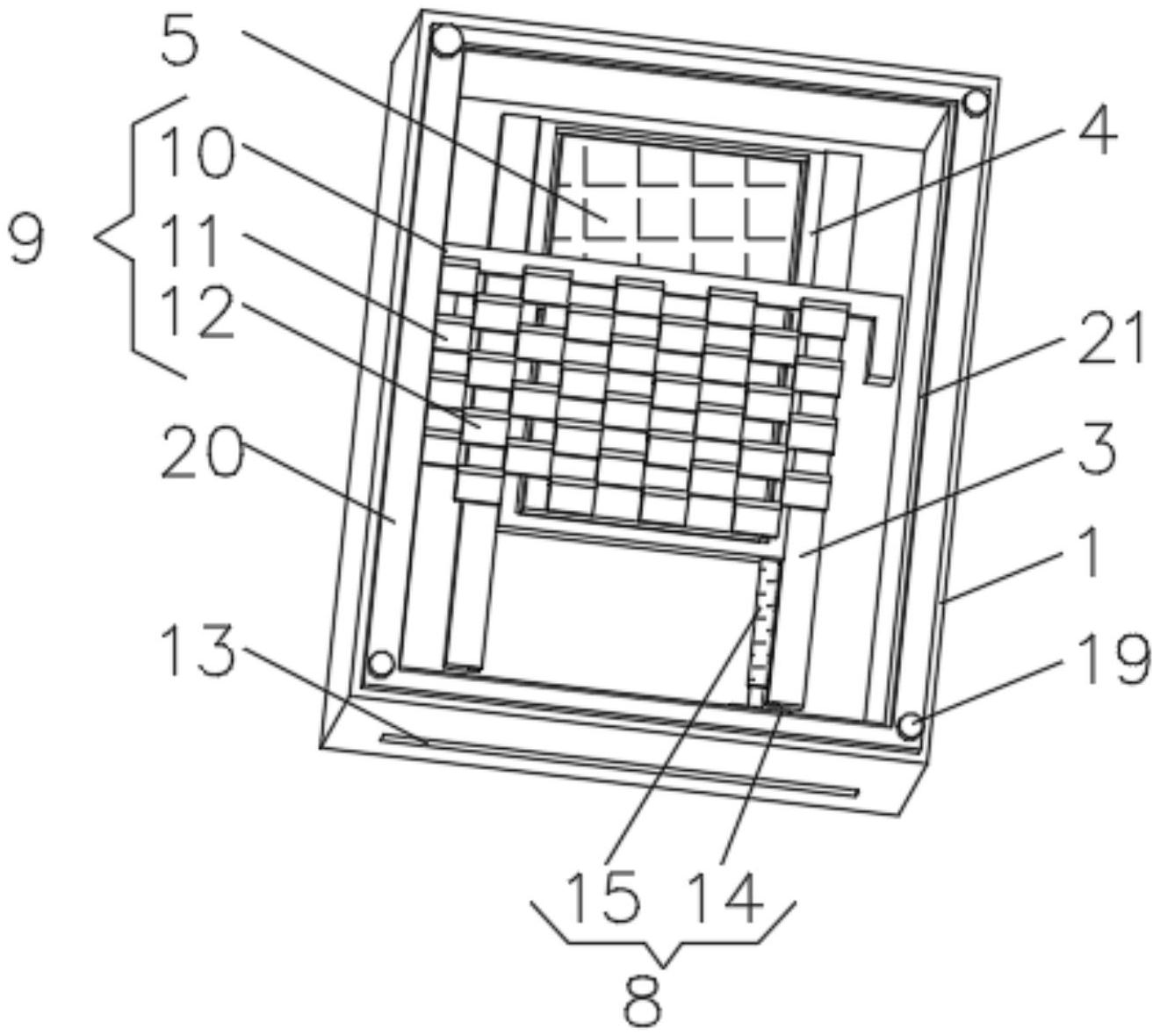 一种能够防尘防水的计算机箱,包括外壳,外壳的一侧开设有散热口,所述外壳的内壁一侧对称安装有滑槽,所述滑槽的两侧之间滑动连接有防尘架,所述防尘架的中间位置安装有防尘网,所述散热口的内壁顶部固定连接有倾斜板,所述倾斜板的底部均匀安装有清扫轮,所述清扫轮与防尘网连接,所述外壳的内壁底部安装有升降装置,所述升降装置与防尘架传动连接,所述外壳的内壁一侧靠近散热口的位置安装有防水装置,所述防水装置包括固定架,所述固定架安装在外壳的内壁一侧,本实用新型涉及计算机箱技术领域。本实用新型解决了现有的计算机箱散热口处容易进入灰尘,灰尘容易聚积在散热口不方便清理,同时机箱不具备防溅水能力的问题。