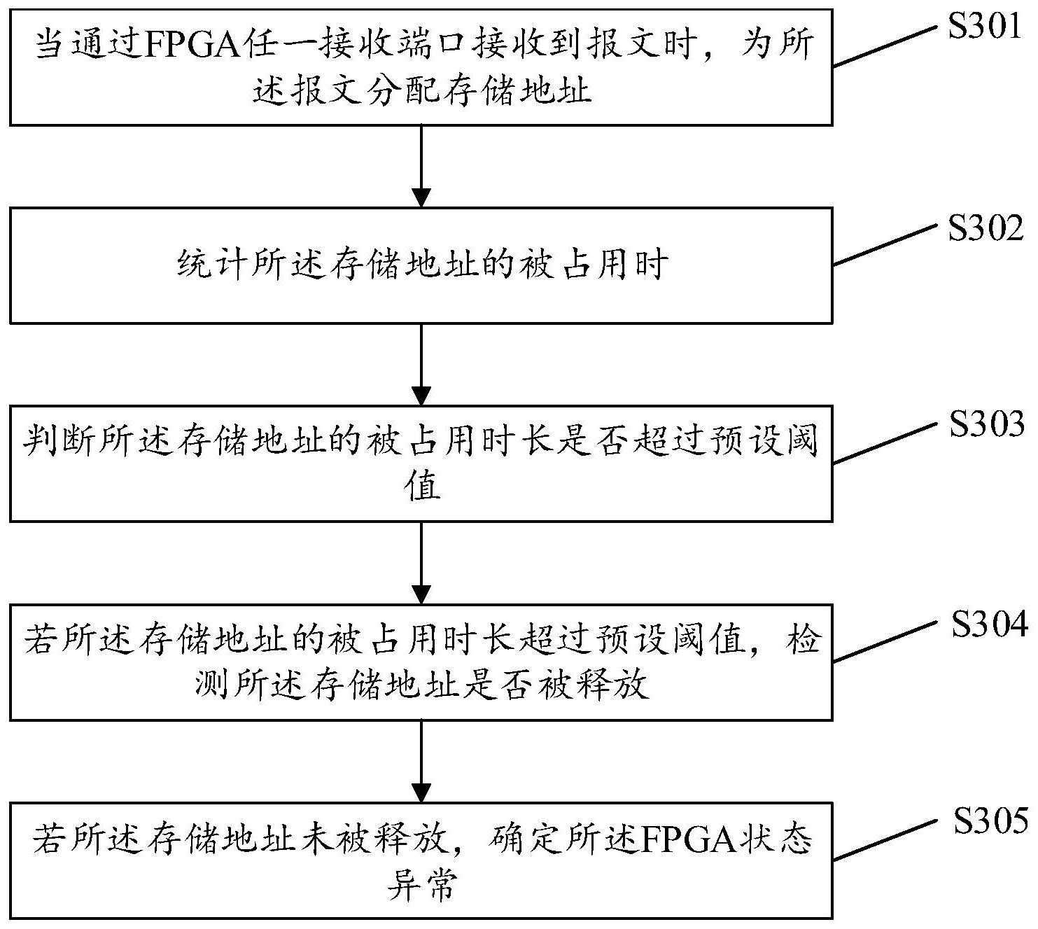 本申请提供一种FPGA状态的检测方法及装置。一种FPGA状态的检测方法,包括:当通过FPGA任一接收端口接收到报文时,为所述报文分配存储地址;统计所述存储地址的被占用时长;判断所述存储地址的被占用时长是否超过预设阈值;若所述存储地址的被占用时长超过预设阈值,检测所述存储地址是否被释放;若所述存储地址未被释放,确定所述FPGA状态异常。