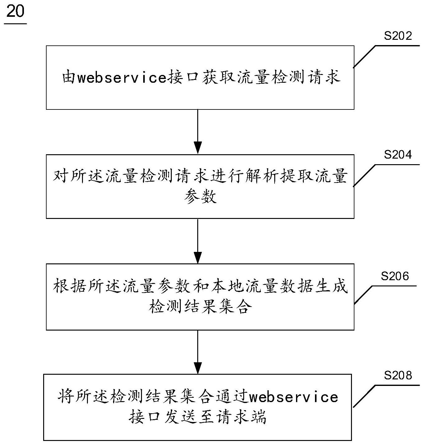 本公开涉及一种基于简单对象访问协议流量检测方法、装置、电子设备及计算机可读介质。该方法包括:由webservice接口获取流量检测请求;对所述流量检测请求进行解析提取流量参数;根据所述流量参数和本地流量数据生成检测结果集合;将所述检测结果集合通过webservice接口发送至请求端。本申请涉及的流量检测方法、装置、电子设备及计算机可读介质,能够将流量检测基于简单对象访问协议模块化,减少维护成本和系统开销,提高系统资源的利用率。