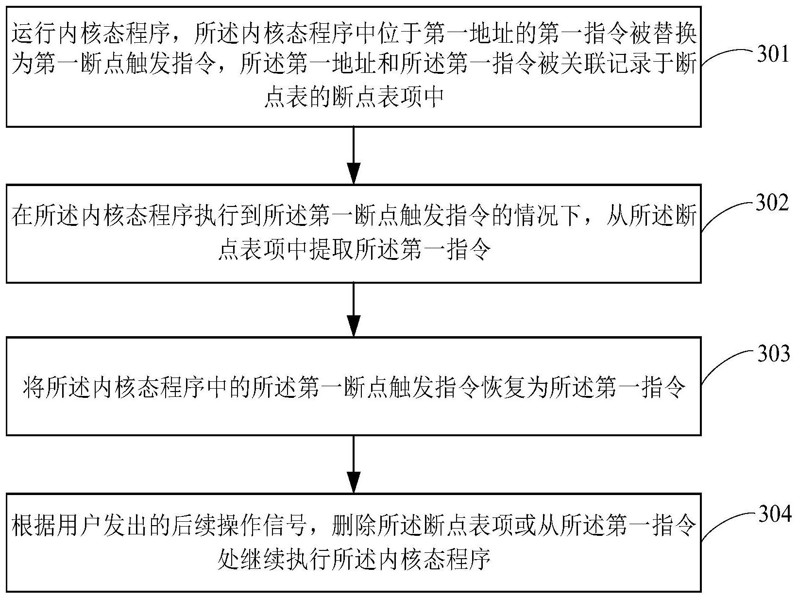本申请提供一种内核态程序的断点处理方法及装置,该方法可以包括:运行内核态程序,所述内核态程序中位于第一地址的第一指令被替换为第一断点触发指令,所述第一地址和所述第一指令被关联记录于断点表的断点表项中;在所述内核态程序执行到所述第一断点触发指令的情况下,从所述断点表项中提取所述第一指令;将所述内核态程序中的所述第一断点触发指令恢复为所述第一指令;根据用户发出的后续操作信号,删除所述断点表项或从所述第一指令处继续执行所述内核态程序。通过本申请的技术方案,无需额外硬件即可根据调试需要对内核态程序进行断点设置与处理,既降低了调试成本又便于操作,同时提高了用户的调试效率。