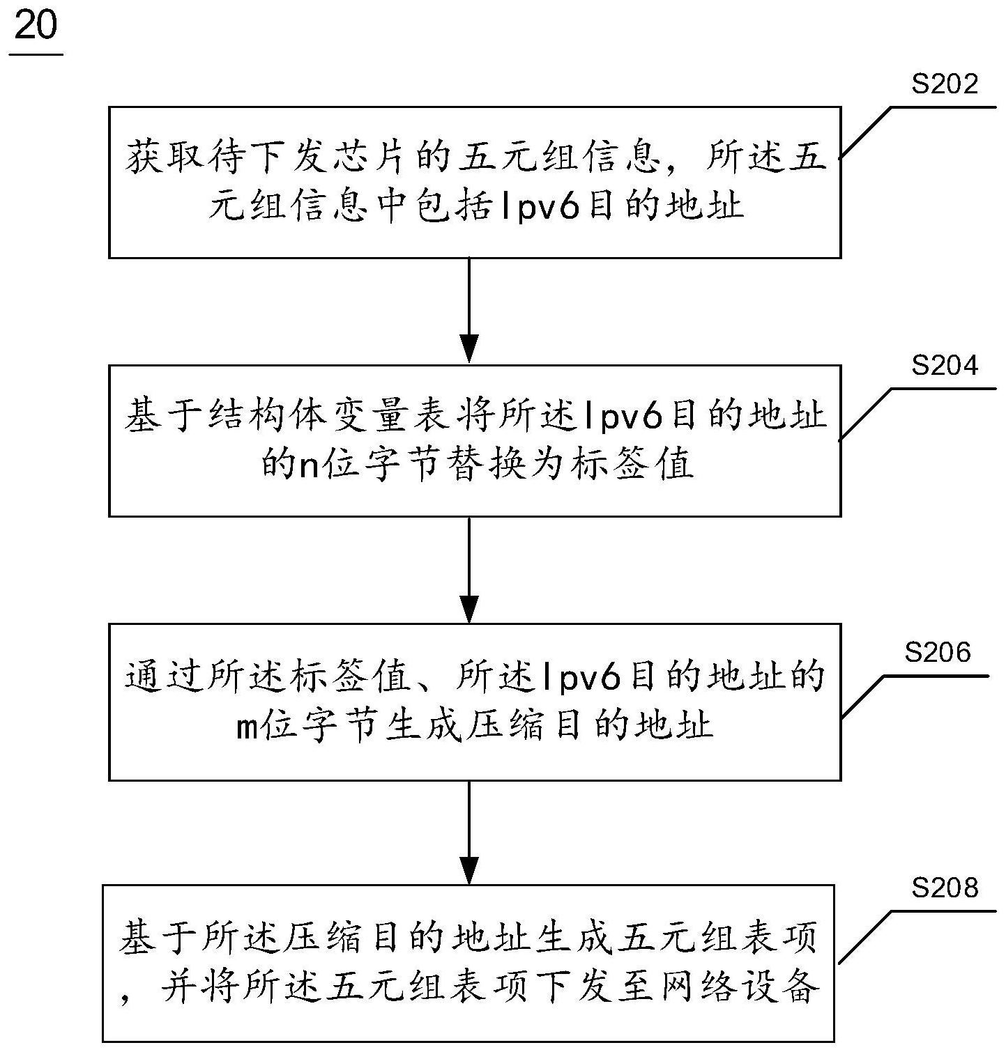 本公开涉及一种五元组表项下发方法、装置、电子设备及计算机可读介质。该方法包括:获取待下发芯片的五元组信息,所述五元组信息中包括IPv6目的地址;基于结构体变量表将所述IPv6目的地址的n位字节替换为标签值;通过所述标签值、所述IPv6目的地址的m位字节生成压缩目的地址;基于所述压缩目的地址生成五元组表项,并将所述五元组表项下发至网络设备。本申请涉及的五元组表项下发方法、装置、电子设备及计算机可读介质,能够将IPv6五元组ACL表项数据全部填入ACL表项的匹配条件变量结构体中,可以保证下刷表项成功,还能够提高表项匹配速度。