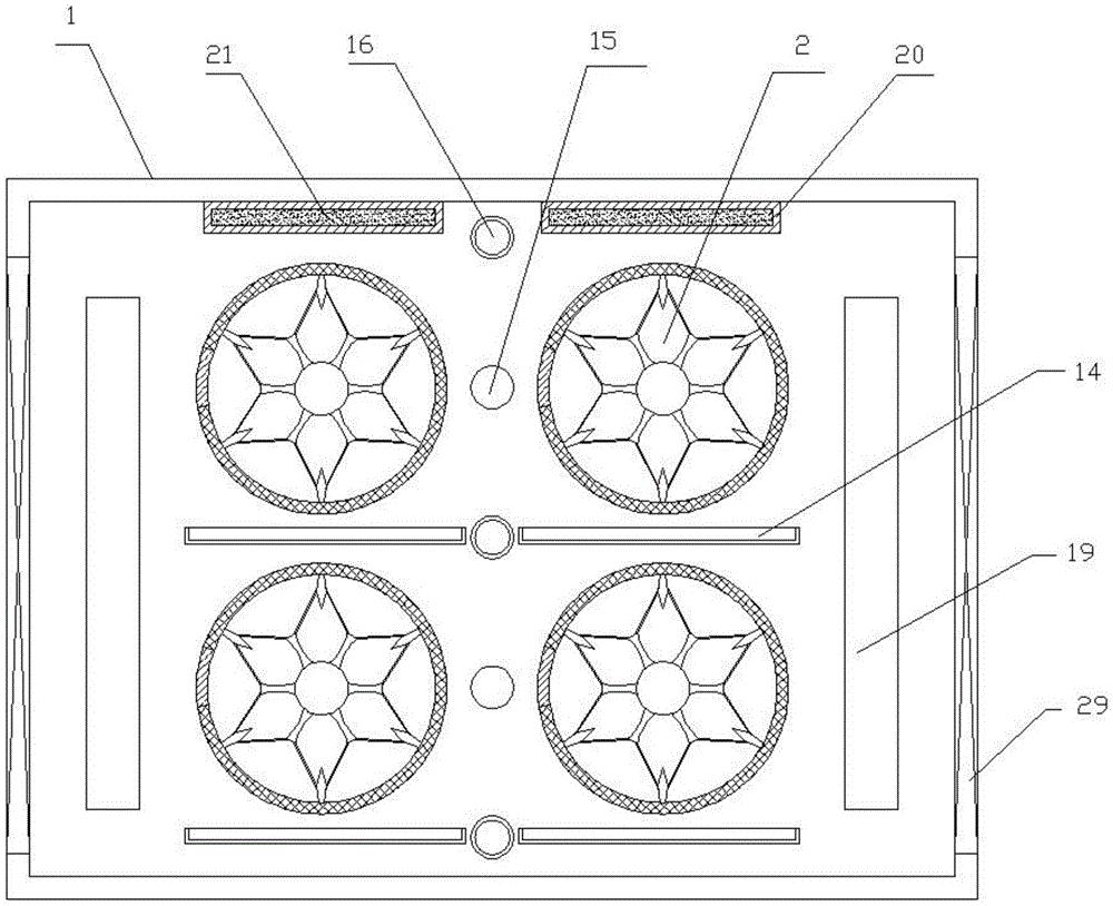 本实用新型提出了一种坚果自动烘烤装置,包括壳体,壳体中矩阵式的布设四个承载组件;承载组件包括圆柱体结构的承载框,承载框由不锈钢丝网焊接成型;承载框通过支承轴可转动的固定在壳体中,承载框一端的支承轴穿过壳体固定一个第一齿轮,四个承载组件的第一齿轮之间通过第一链条相连接,其中一个第一齿轮上同轴的固定一个第二齿轮,第二齿轮通过第二链条与固定在电机上的第三齿轮相连接,电机带动第三齿轮转动,从而带动四个承载框在壳体中进行转动,本实用新型提高了烘烤效率,避免坚果在烘烤过程中造成损坏。