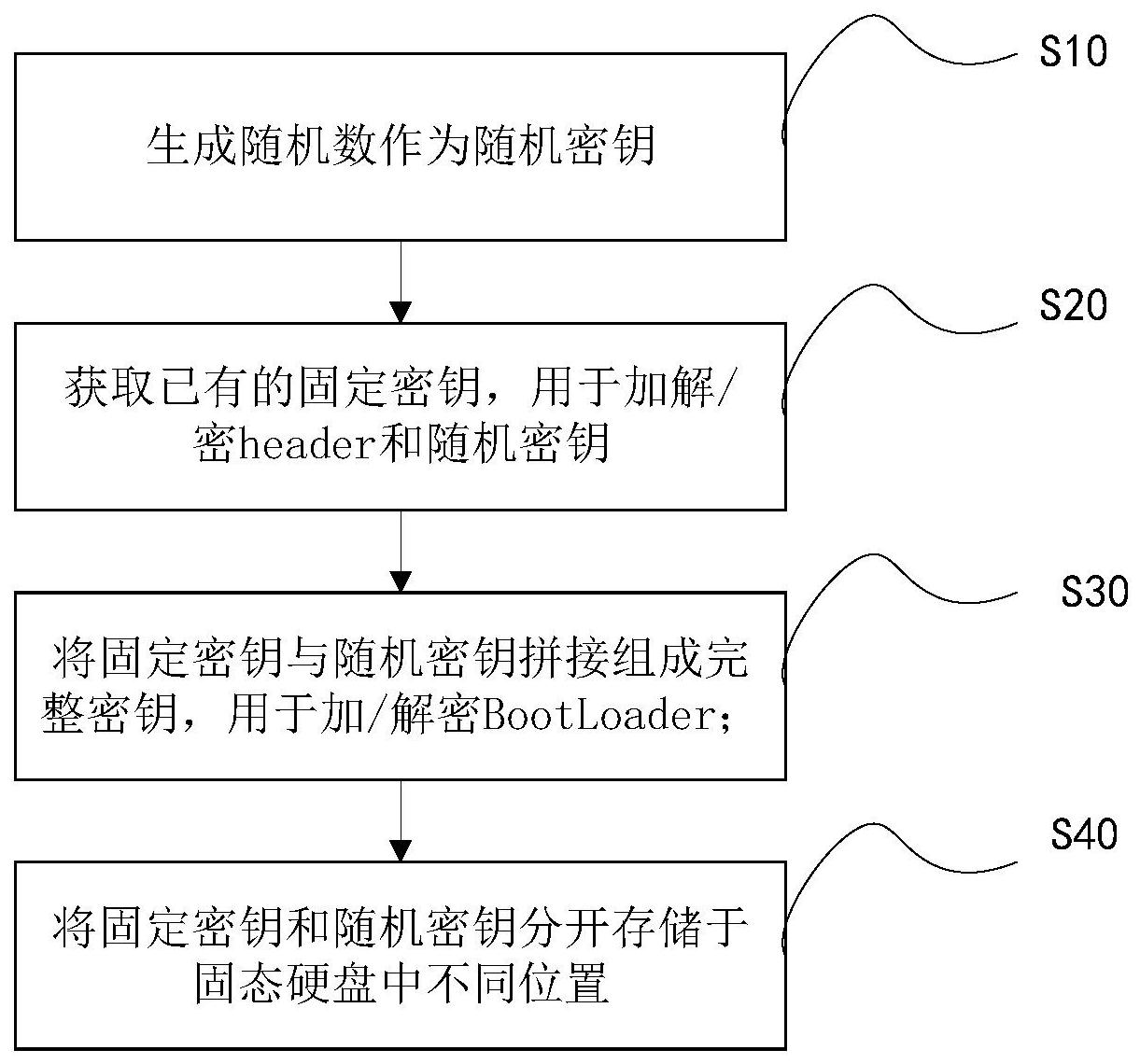 本发明公开了一种固态硬盘控制器安全加载方法、装置及存储介质,方法包括以下步骤:生成随机数作为随机密钥;获取已有的固定密钥,用于加解/密header和随机密钥;将固定密钥与随机密钥拼接组成完整密钥,用于加/解密BootLoader;将固定密钥和随机密钥分开存储于固态硬盘中不同位置。本方案将用于加解密BootLoader固件的256bit完整密钥拆分成随机密钥和固定密钥,将固定密钥和随机密钥分开存储于固态硬盘中不同位置,提高破解获取完整密钥的难度,保证bootloader固件的安全性。