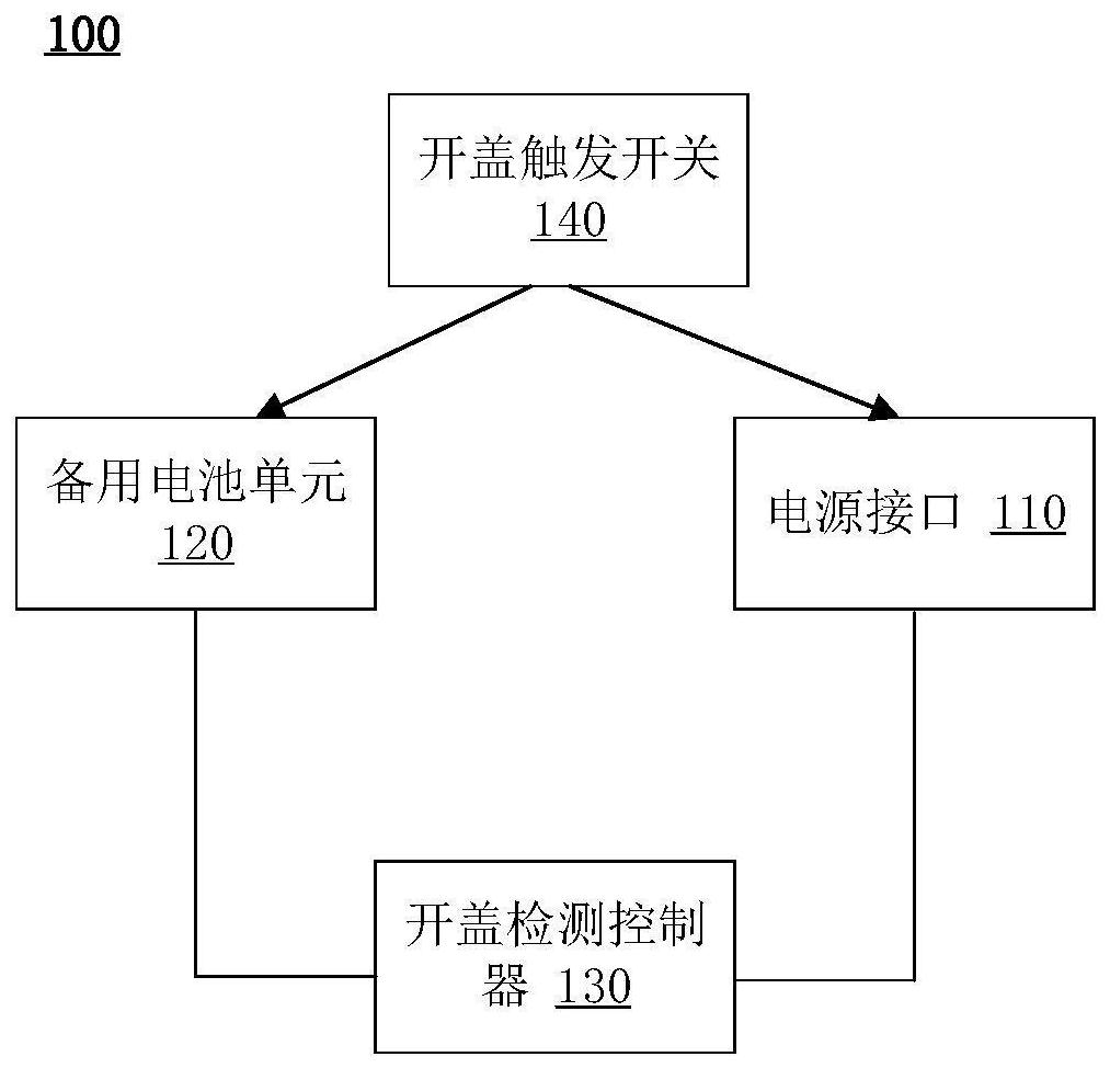 本申请适用于服务器技术领域,提供了一种服务器机箱开盖检测方法及装置,该装置包括:服务器的电源接口;备用电池单元;开盖检测控制器,与服务器的电源接口和备用电池单元分别连接,用于根据开盖触发开关的状态检测服务器机箱是否处于开盖状态;开盖触发开关,其中开盖触发开关的第一开关状态和第二开关状态分别与服务器机盖的关闭状态和开盖状态相对应,以及在第二开关状态下的开盖触发开关用于触发备用电池单元向开盖检测控制器进行供电。由此,使得服务器机箱开盖检测功能在电源接口断电的情况下仍然可以正常进行,保障了服务器的硬件安全性。