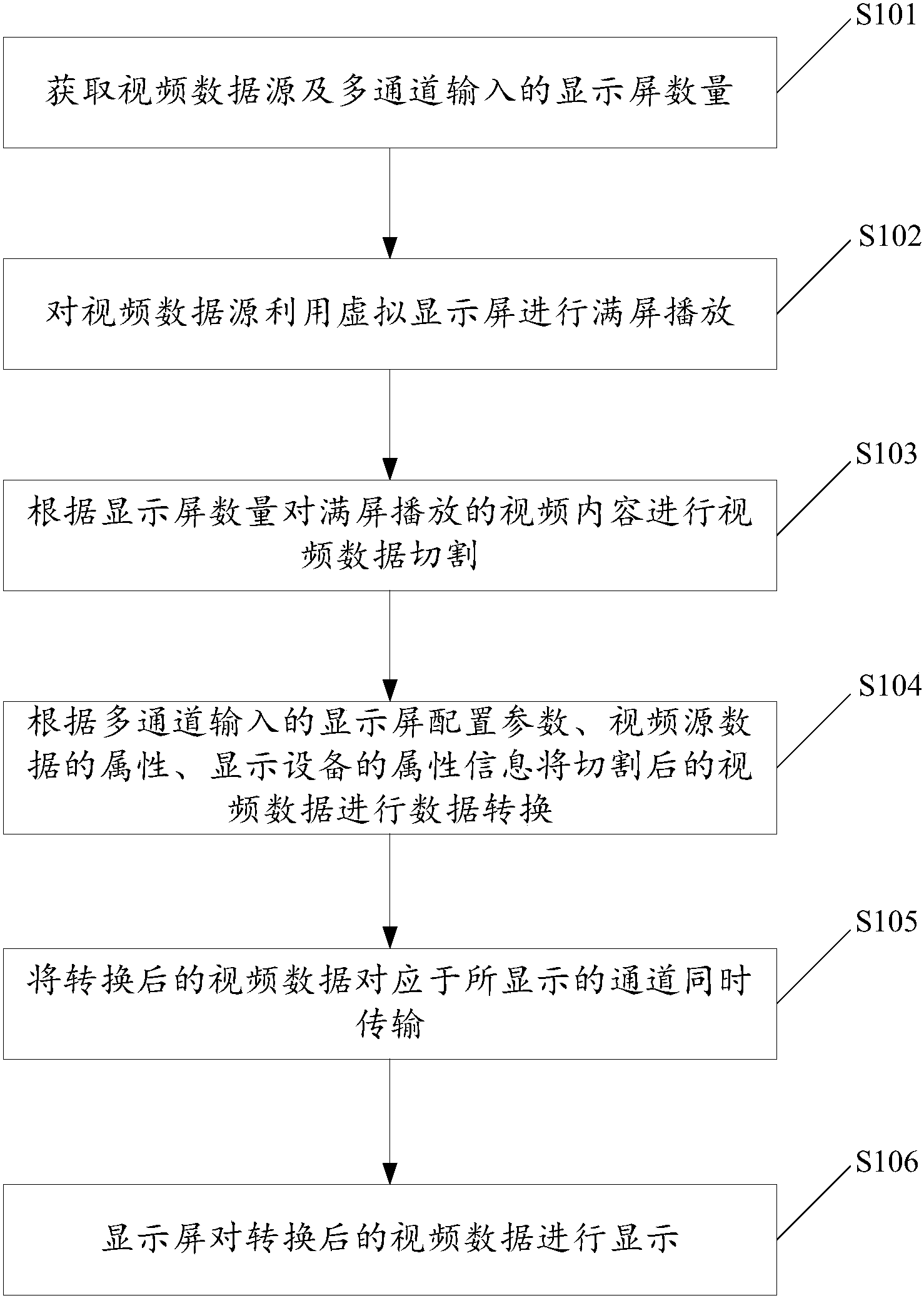 本发明公开了一种基于多通道输入大屏显示的方法及系统,其中方法包括如下步骤:获取视频数据源及多通道输入的显示屏数量;对视频数据源利用虚拟显示屏进行满屏播放;根据显示屏数量对满屏播放的视频内容进行视频数据切割;根据多通道输入的显示屏配置参数、视频源数据的属性、显示设备的属性信息将切割后的视频数据进行数据转换;将转换后的视频数据对应于所显示的通道同时传输;显示屏对转换后的视频数据进行显示。本发明基于虚拟机按照显示屏幕数量对视频数据源进行切割,从而保障了视频文件在多通道显示屏上的满屏再现,从而解决了显示屏对分辨率的限制,同时由于采用的多个输出显示设备的组合显示。