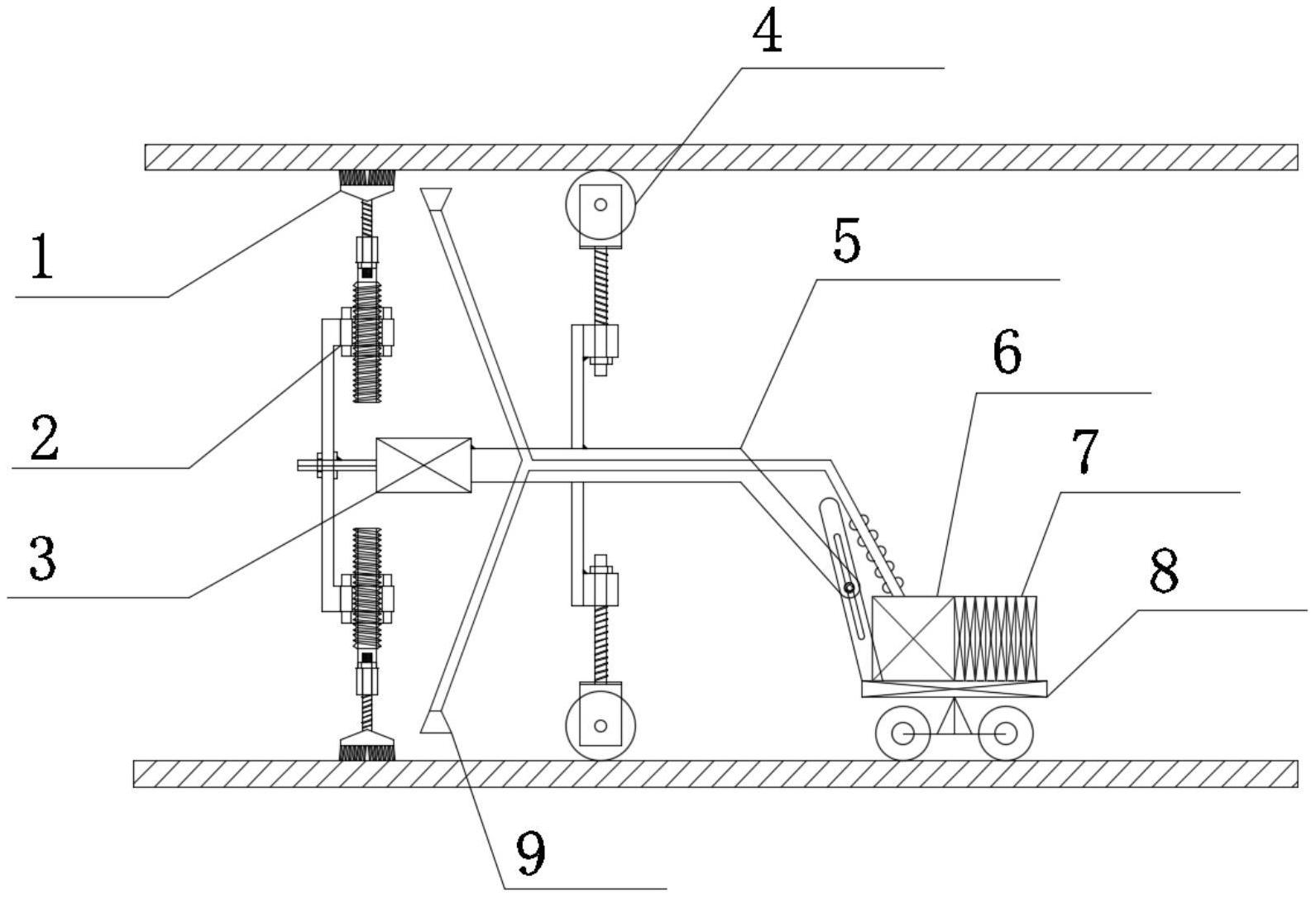 本实用新型公开了一种遥控式自动吸尘管道内壁除锈装置,可以适应不同直径管道的同时也提高了除锈效率,其技术方案为:一种遥控式自动吸尘管道内壁除锈装置,包括轮毂,所述轮毂中心固定连接在电机的主轴上,所述轮毂外侧螺纹连接有第一调节螺杆,所述第一调节螺杆为弹簧伸缩杆,所述第一调节螺杆的外端设置有钢丝刷。