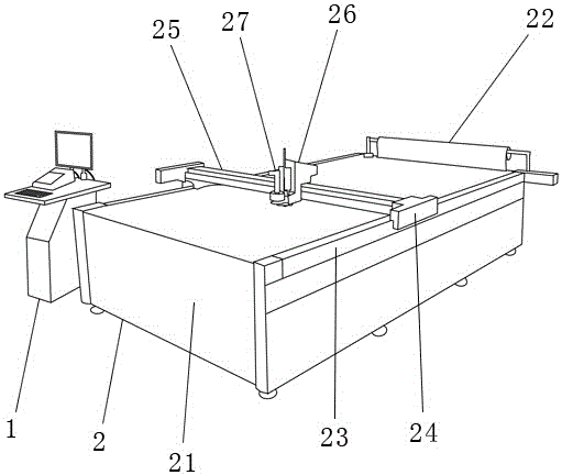本实用新型涉及皮箱生产加工领域,具体涉及一种自动化皮箱裁剪系统,包括相连的控制器和自动裁床,所述控制器包括排版模块,所述自动裁床包括床体、放卷机构、两条滑轨、两个滑块、切刀架、切刀座和激光切刀,所述放卷机构设置在床体的一端、所述两条滑轨分别设置在所述床体的两侧,所述两个滑块分别设置在所述两条滑轨上,所述切刀架两端分别与所述两个滑块连接,所述切刀座设置在所述切刀架上,所述激光切刀设置在所述切刀座上。本实用新型结构科学合理,以排版模块进行智能版面排列,提高皮料的使用率,降低皮料损耗,节约材料成本,再通过自动裁床进行裁剪,提高裁剪精度,保证产品质量,在降低人工成本的同时还能有效提高生产效率。