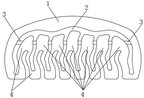 本实用新型涉及生活用品技术领域,尤其是一种按摩梳子。一种按摩梳子,包括梳背和梳齿,梳齿与梳背之间为贯通梳背的梳背槽,在梳背内有用于支撑的支撑杆,支撑杆穿过所有的梳齿上端部分。这种按摩梳子在使用的时候,梳齿安装在支撑杆上,支撑杆具有一定的弹性,在梳发的时候,按压梳背,梳齿接触头皮之后能够向上移动,增加梳齿与头皮的接触点,按压之后能够对头皮进行挤压,实现按摩。