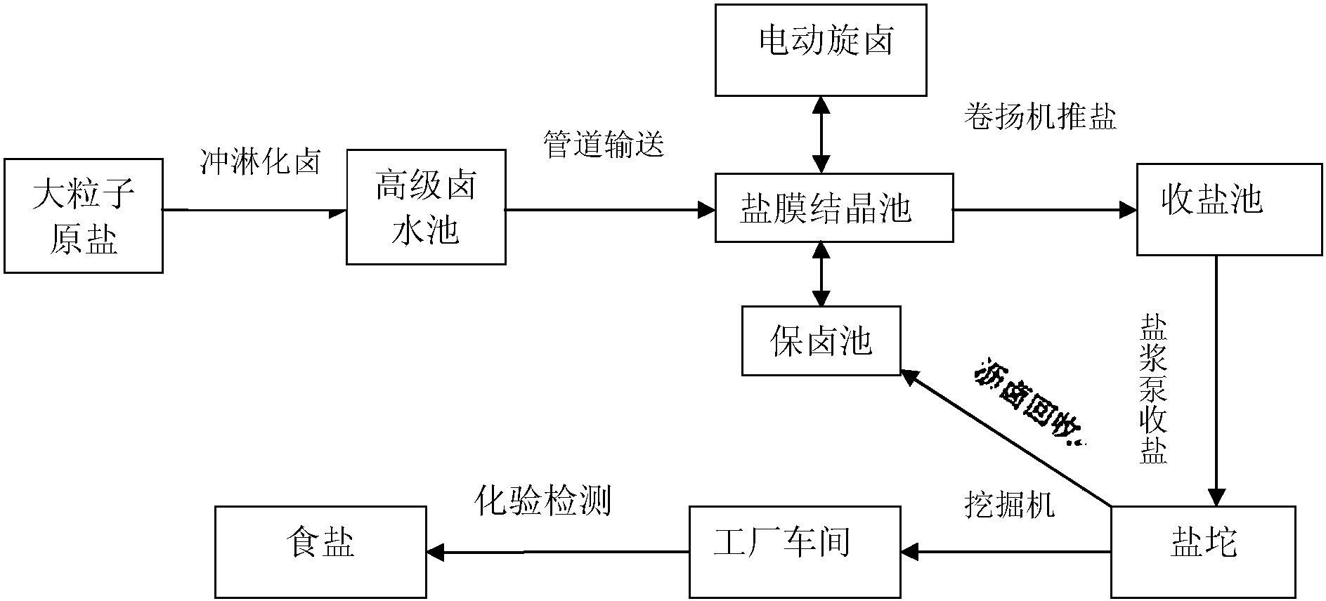 本发明涉及一种日晒重结晶制盐工艺,其特征在于包括以下步骤:①利用海水或卤水对大颗粒的原料盐冲淋,得到较高浓度卤水;②将步骤①中集中化卤得到的高级卤水送至各结晶滩池;③利用机械打花机打花旋盐;④在步骤③中结晶完成之后,盐卤集中至收盐池,并排除多余卤水;⑤利用盐浆泵将盐卤混合物输送堆垛;⑥将步骤④中卤水返回保卤澄清池重利用结晶;⑦出运,与现有技术相比,本发明的优点在于:利用海水或混合卤水冲淋原料盐,不需要机械设备的搅拌,在较短时间内得到高级卤水;利用管道系统及机械打花机、卷盐机、盐浆泵、挖掘机等收盐堆盐,提高单位面积原盐产量,节省人工劳力;产品质量洁白细腻,可作为各种食用盐产品的良好加工原料。