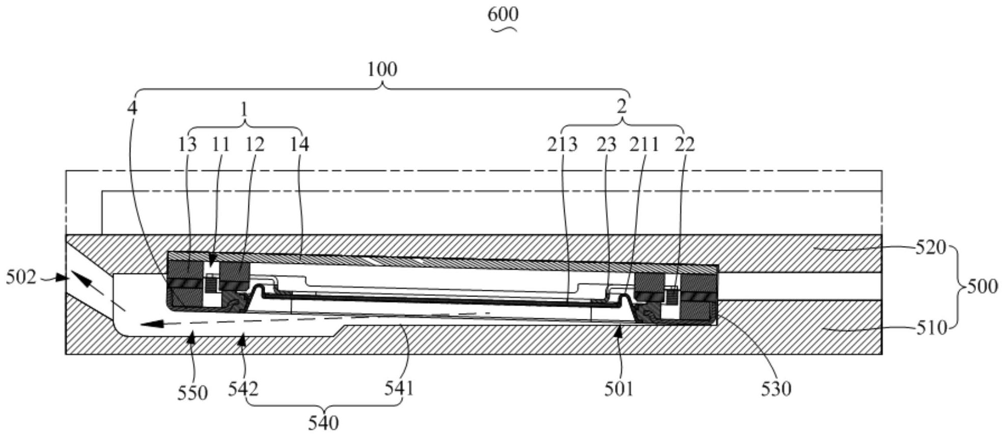 本发明公开一种电子设备,该电子设备包括机壳和发声装置,发声装置设于机壳的安装腔室内,发声装置包括磁路系统和振动系统,磁路系统呈中空设置,以限定出容纳空间,振动系统包括振膜组件、音圈及骨架,振膜组件位于容纳空间内,音圈插设于磁路系统的磁间隙内,骨架的一端与振膜组件相连,骨架的另一端伸入磁间隙,并与音圈相连;其中,机壳的侧壁上设有出声口,发声装置与安装腔室的内周壁配合限定出与出声口连通的侧出声通道。本发明提供的电子设备将发声装置的振动辐射面放置在磁路系统中间,并通过骨架将音圈与振动辐射面连接,传递运动载荷,不仅极大的降低了发声装置的厚度尺寸,还有效降低高频谐振,提高声学性能,且方便加工和装配。