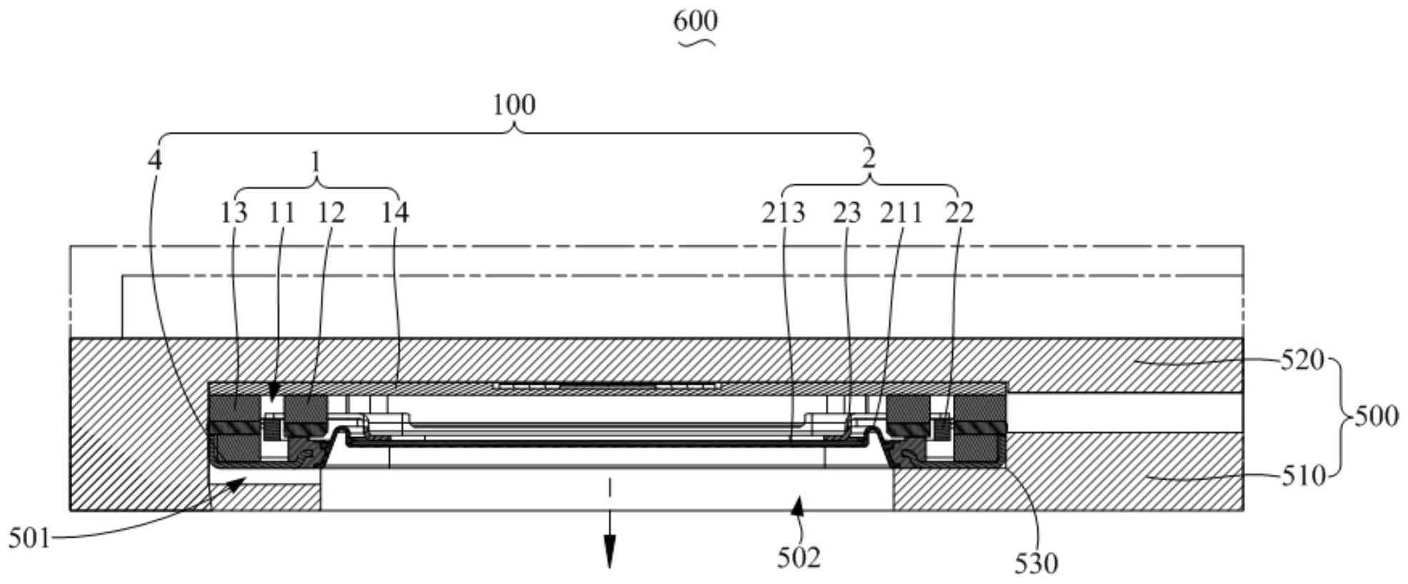 本发明公开一种电子设备,该电子设备包括机壳和发声装置,机壳内设有安装腔室,机壳还设有与安装腔室连通的出声口,发声装置设于安装腔室内,发声装置包括磁路系统和振动系统,磁路系统设有磁间隙,磁路系统呈中空设置,以限定出容纳空间,振动系统包括振膜组件、音圈及骨架,振膜组件位于容纳空间内,音圈插设于磁间隙内,骨架的一端与振膜组件相连,骨架的另一端伸入磁间隙,并与音圈相连;其中,振膜组件与出声口正对设置。本发明提供的电子设备将发声装置的振动辐射面放置在磁路系统中间,并通过骨架将音圈与振动辐射面连接,传递运动载荷,不仅极大的降低了发声装置的厚度尺寸,还有效降低高频谐振,提高声学性能,且方便加工和装配。