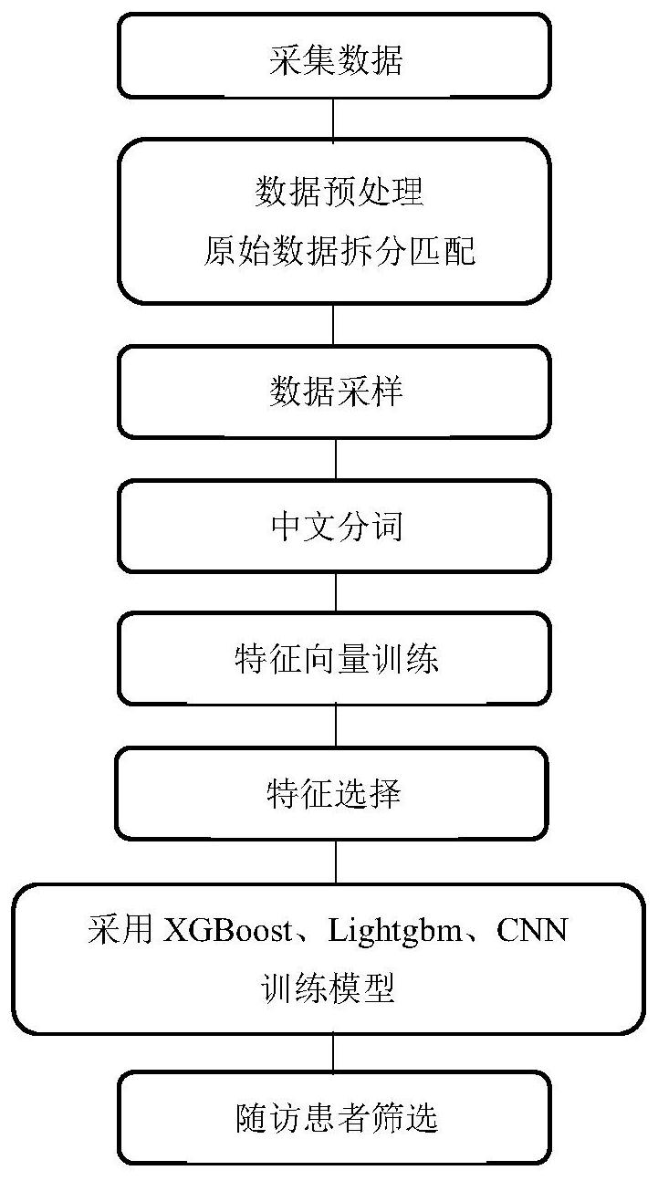 本发明提供了一种基于机器学习的超声随访患者筛选方法。由于深度学习技术的快速发展,利用自然语言处理技术和深度学习技术成为了分析医疗文本的重要手段,是替代人工筛查文本的有效途径。本发明通过JIEBA分词工具对文本内容进行分词,并采用TF‑IDF方法和Word2Vec算法分别构建词向量,进一步利用卡方检验方法对特征向量进行选择。分类模型选择XGBoost、Lightgbm和CNN对特征数据进行训练建模,实现了对超声检查随访列表的自动筛选。