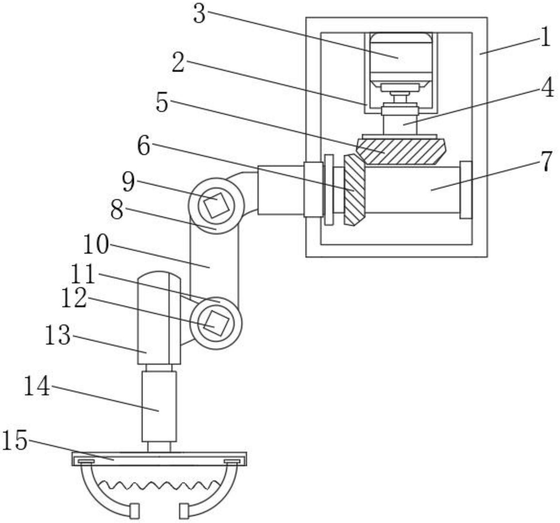 本实用新型公开了一种多介数字印刷机的机器人手臂,包括控制箱,所述控制箱内壁的顶部固定连接有电机箱,所述电机箱内壁的顶部固定连接有电机,所述电机的输出轴固定连接有转杆,所述转杆的底端固定连接有第一锥形齿轮,所述第一锥形齿轮的底部啮合有第二锥形齿轮,所述第二锥形齿轮的轴心处固定连接有圆杆,所述圆杆的一端贯穿控制箱并延伸至控制箱的外部。本实用新型所述的一种多介数字印刷机的机器人手臂,设有弧型杆与电机,能够为机器人在印刷领域的广泛的深入研究提供了平台,还可以保证多介质数字印刷机机器人手臂在不同抓姿中保持在同一位置高度的水平面内运动,便于印刷时的套印的准确性,带来更好的使用前景。