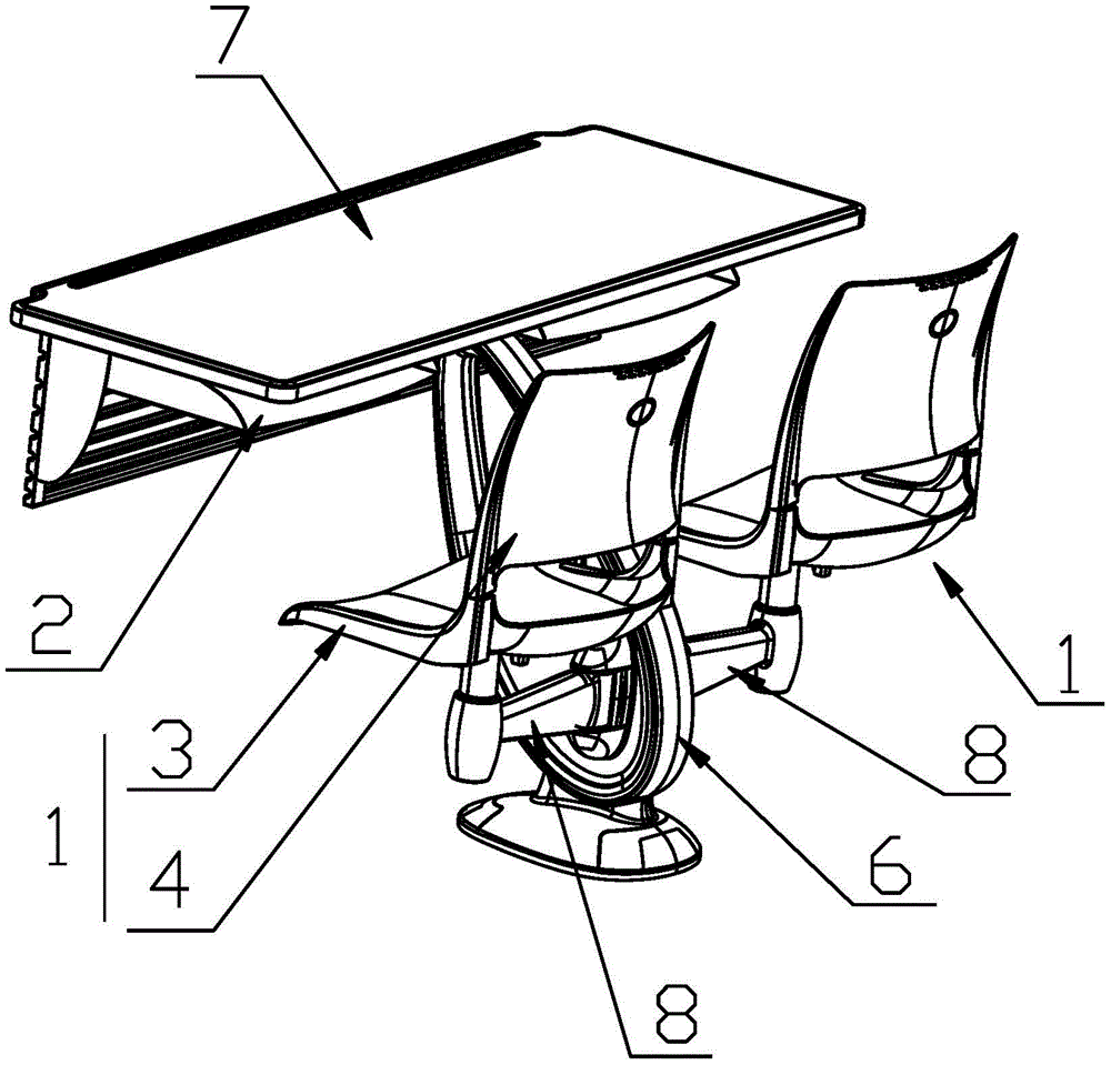本实用新型公开了一种一体式多功能课桌椅,包括竖向倾斜设置的支撑底座,所述支撑底座的上部固定支撑有桌板,下部通过摆臂支撑有座椅,所述摆臂与座椅一一对应设置,并以可转动方式安装于支撑底座上,能够水平转动以靠近或远离所述桌板,所述座椅固定安装于摆臂上。通过一体化支撑结构,减少支撑部件,降低制造成本,提高安装效率,同时节省空间占用,配合转动式座椅设计,便于用户就坐或离座,再通过角度适应机构实现座椅靠背的角度适应,提高座椅舒适性,大大改善用户体验感。