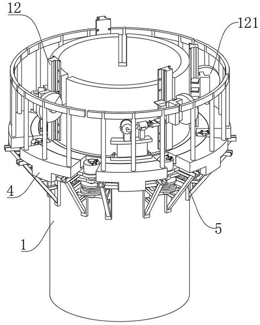 本发明涉及建筑施工技术领域,具体为用于拆除烟囱的可移动式施工操作平台,包括烟囱本体,设置于烟囱本体上的抱箍组,设置于抱箍组上的多个支撑板架,支撑板架上设置有滑动板架,且烟囱本体上安装有多个支架本体,其中支架本体上设置有固定框架,且滑动板架端部设置有限位块,并在固定框架内部设置有弹性件,支架本体上设置有调控单元,此用于拆除烟囱的可移动式施工操作平台,利用弹性件和卷绳件以及其上的绳体对限位块所连接的滑动板架进行位置调整,滑动板架可有效向外扩张,有效降低因施工范围小而出现坠落的风险,并在棘轮组和棘爪组的作用下,控制转轴的转动状态,转轴上的卷绳件得以被限定,对滑动板架的收缩或扩张状态进行限定。
