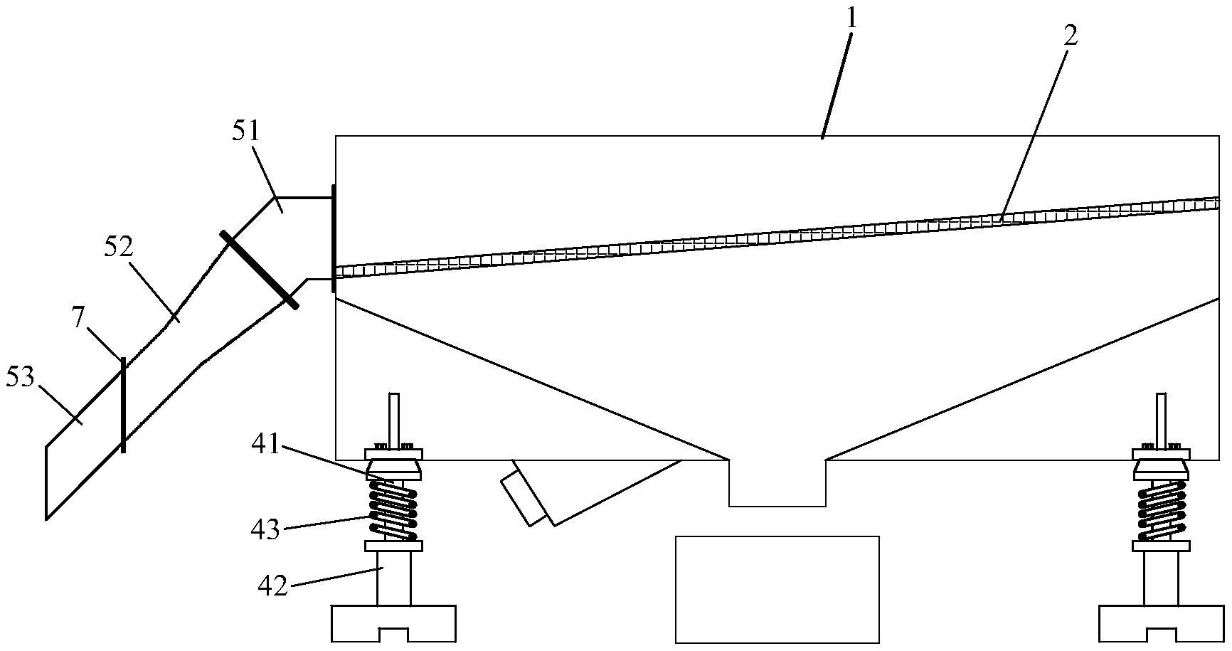 本实用新型涉及一种简易热熔胶颗粒筛料装置,其包括壳体、筛网、振子、减震底座和出料管道;壳体安装在减震底座上,振子安装在壳体底部,用于产生震动;壳体顶部敞开,筛网呈倾斜地安装在壳体内,壳体底部具有废料出口,在与筛网低端连接的那一侧壳体上设置有出料口,出料管道的一端与出料口连接,出料管道的另一端与提升机底部进料口连接;出料管道包括依次连接的弯管、软管和直管,弯管和直管均为硬管,弯管与壳体的出料口连接,直管与提升机底部进料口连接。本申请出料管道中设置一段软管,软管的两端是和硬管连接的,这样壳体在上下震动过程中,由于软管具有一定形变能力,因此不会对出料管道造成拉扯损伤。