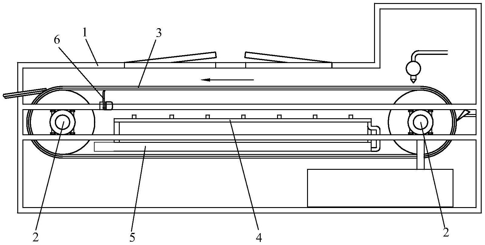 本实用新型涉及一种热熔胶干式水冷装置,包括机架、滚筒、传送带、刮水板装置、喷淋水管和集水箱;滚筒设置两个,相平行地安装在机架上;传送带安装在两个滚筒上;喷淋水管安装在集水箱上方,且位于传送带中的上层传送带的下方,其用于向上层传送带的下表面喷水;刮水板装置靠近输出末端的那个滚筒,刮水板装置的两端与机架连接,且位于传送带中的上层传送带的下面,用于将上层传送带下表面的水刮掉。本实用新型利用刮水板将传送带中的上层传送带下表面的水刮掉并将水回收至集水箱中,避免水被带到靠近输出末端的那个滚筒上。