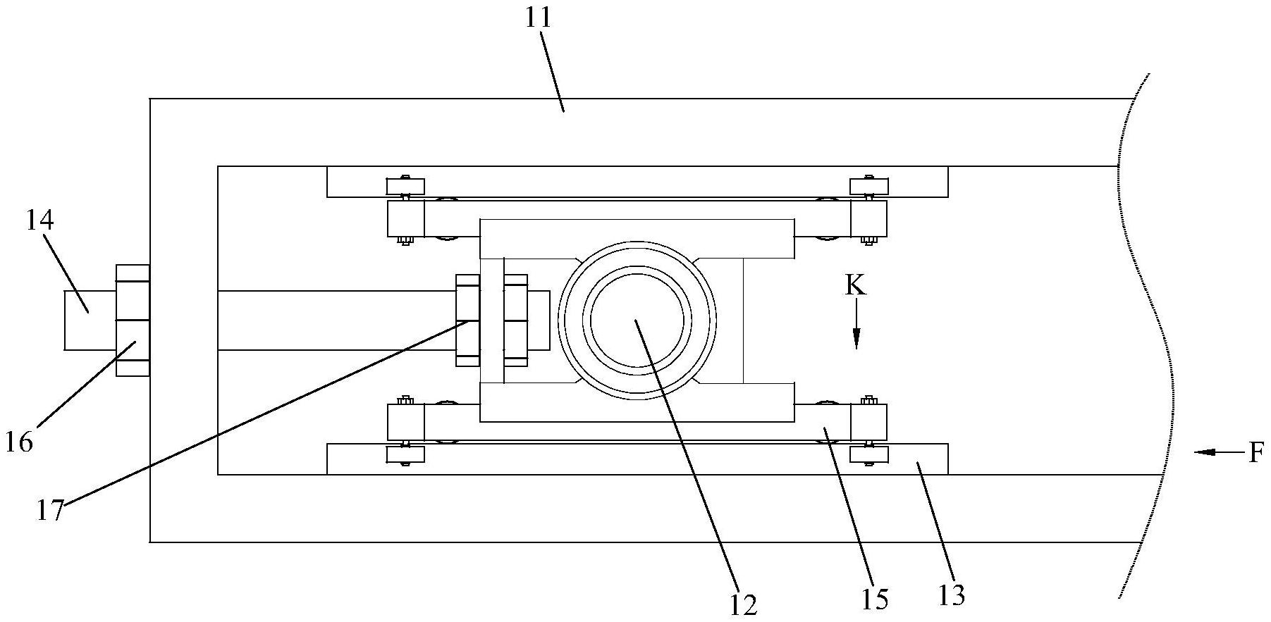 本实用新型涉及一种热熔胶制粒设备中的滚筒轴安装结构,包括支撑框架、轴承座、导轨和张紧用螺杆;导轨设置两根,呈上下对应地安装在支撑框架上,轴承座设置在两根导轨之间,轴承座的顶部和底部均安装一套滚轮组件,滚轮组件与导轨配合,使轴承座能沿导轨移动可调;张紧用螺杆的一端与支撑框架的一侧连接,张紧用螺杆的另一端与轴承座的一侧连接。本实用新型中的轴承座安装方便、在安装过程中其安装位置方便调节,调节到位后利用张紧用螺杆进行固定。