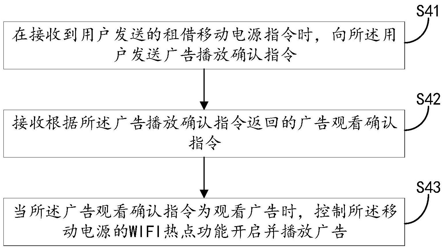 本发明实施例涉及移动电源租赁技术领域,特别是涉及一种移动电源的广告推广方法、系统及移动电源。该方法包括:在接收到用户发送的租借移动电源指令时,向所述用户发送广告播放确认指令;接收根据所述广告播放确认指令返回的广告观看确认指令;当所述广告观看确认指令为观看广告时,控制所述移动电源的WIFI热点功能开启并播放广告。本发明实施例通过为用户提供WIFI热点的方式来提升用户观看广告的积极性,从而提高了移动电源的广告增值效果。
