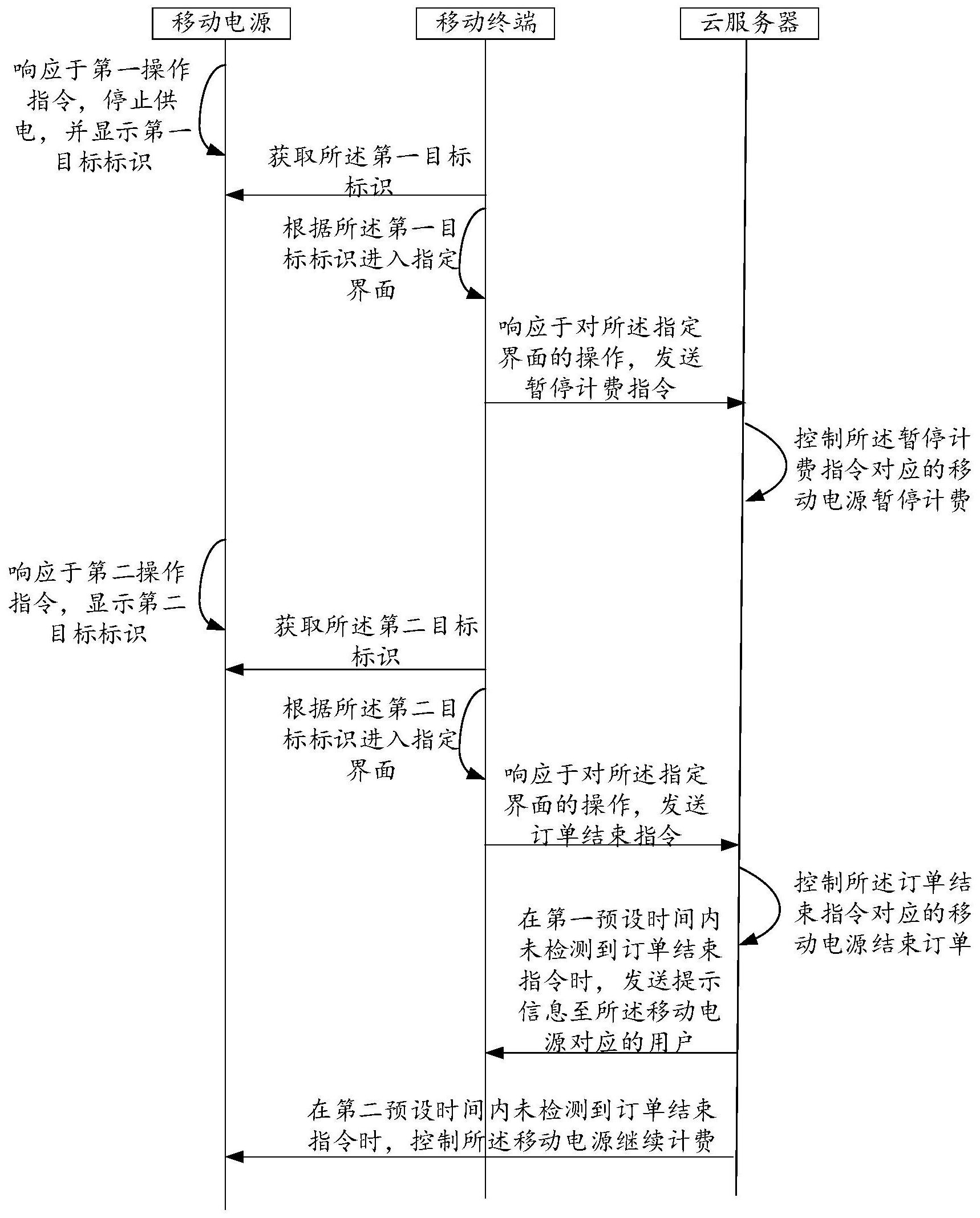本发明实施例提供了一种移动电源订单结束方法及计算机可读存储介质。所述移动电源订单结束方法包括:通过获取第一操作指令,然后根据所述第一操作指令提供第一目标标识,触发暂停计费指令,使得云服务器根据所述暂停计费指令控制所述移动电源暂停计费,接着获取第二操作指令,根据所述第二操作指令提供第二目标标识,进而触发订单结束指令,使得所述云服务器根据所述订单结束指令控制所述移动电源的订单结束。通过上述方法及计算机可读存储介质,本发明实施例能够在无法立即找到移动电源租赁设备或移动电源租赁设备没有空余的仓位时,立即使所述移动电源暂停计费或结束订单。