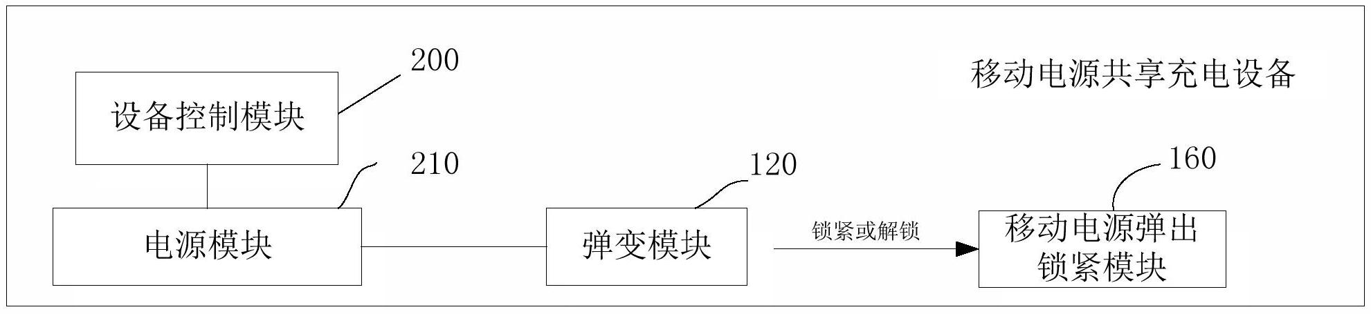 本申请涉及一种移动电源共享充电设备,其中,移动电源共享充电设备包括设备控制模块、电源模块和弹变模块;电源模块与设备控制模块以及弹变模块连接,由设备控制模块控制电源模块给弹变模块通电或断电;从而实现移动电源共享充电设备完成移动电源出借或归还操作。