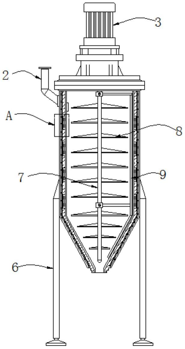 本实用新型公开了一种用于瓷砖背胶加工的搅拌设备,包括外罐体,外罐体一侧的顶端设置有进料管,所述外罐体的内部设置有内罐体,且内罐体和外罐体之间设置有隔热保温结构,所述内罐体的内部设置有电热块,所述内罐体的内壁设有与电热块连接的导热板,所述内罐体的内部设置有搅拌轴,搅拌轴的外壁上固定有搅拌叶,搅拌轴连接有第一电机,所述外罐体的底端安装有支撑腿,支撑腿的顶端设置有与内罐体内腔导通的取料机构,本实用新型通过设置有取料机构,排料时,物料流入取料机构,通过取料机构进行取料,方便接料,避免将通放置到外罐体底端的正下方,支撑腿阻挡,可直接用料桶接料,或使用流水线生产,用皮带带动料桶进行流水线式接料。