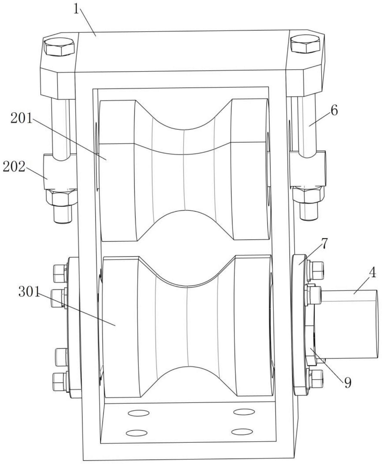 本实用新型公开了一种基于编码器的管道测量装置,属于管路测量技术领域,包括固定支架、第一转动组件、第二转动组件和编码器本体,固定支架设于管道卷筒的前端,固定支架的前后两端敞口,固定支架内转动设有第一转动组件和第二转动组件,第一转动组件位于第二转动组件的上方,管道由第一转动组件和第二转动组件的间隙内伸出,固定支架的外侧壁上固定设有编码器本体,且编码器本体的输入轴套设于第二转动组件内。编码器本体通过测量第二转动组件的转动周期得出过水胶管伸出的长度,从而得到清洗管道的长度,方便掌握清洗的进度。