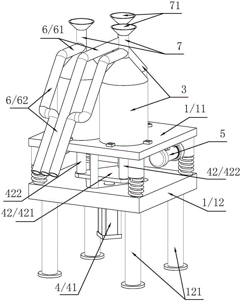 本实用新型涉及一种可控比例的砂浆原料出料机,包括机架,机架上设置有若干的原料桶及驱动装置,各原料桶的轴向为竖直方向,各原料桶的顶部朝上开设有出料口、底部朝下开设有推料进口,驱动装置包括驱动气缸、连接件及推动平板,推动平板的数量与原料桶的数量对应设置,且各推动平板沿竖向滑移沿设置于对应的原料桶内,所述驱动气缸设置于各原料桶下方,且驱动气缸的输出轴沿竖直方向朝上设置,连接件设置于驱动气缸及各推动平板之间,且连接件上端与各推动平板固定连接,下端与驱动气缸的输出轴固定连接。采用上述方案,提供一种设置不同尺寸的原料桶并通过驱动装置推送推动平板来挤出比例可控的各项原材料的一种可控比例的砂浆原料出料机。