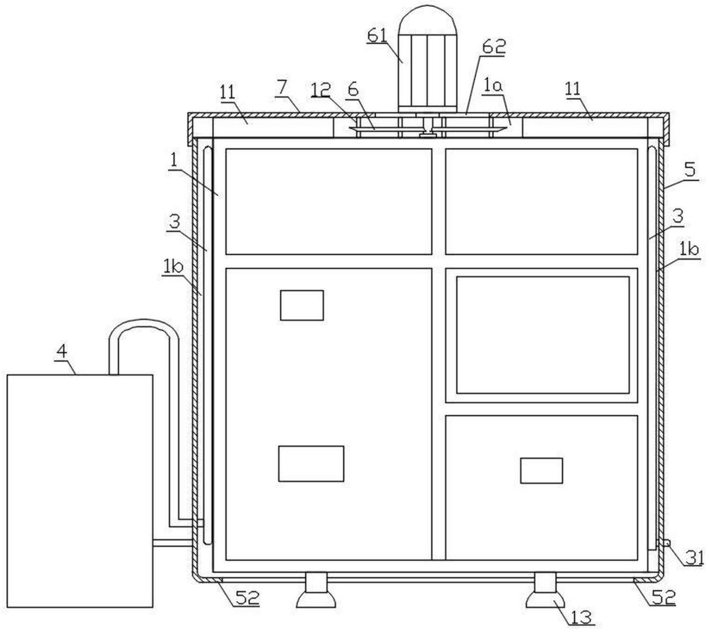 本实用新型涉及配电开关设备领域,具体公开了一种交流金属封闭配电开关设备,水箱内设有连接吸热管的水泵,吸热管连续弯曲成U形,并由柜体的左侧面、后侧面延伸至右侧面;侧罩由柜体的后侧罩向前罩设于柜体的左侧面和右侧面,侧罩的左右两端边缘设有贴紧柜体侧面的凸边,侧罩的底部设有延伸至柜体下方的引风底边;顶盖位于柜体的正上方,顶盖与柜体顶面形成第二风道,顶盖连接侧罩,柜体的顶部左右两端设有若干沿左右方向延伸设置的第一吸热引导板,柜体的顶部后侧设有沿前后方向延伸的第二吸热引导板;风扇设于柜体的顶部中心,顶盖的顶部设有第一电机,该第一电机具有穿过顶盖连接风扇的旋转轴;顶盖位于第一电机处设有风孔。