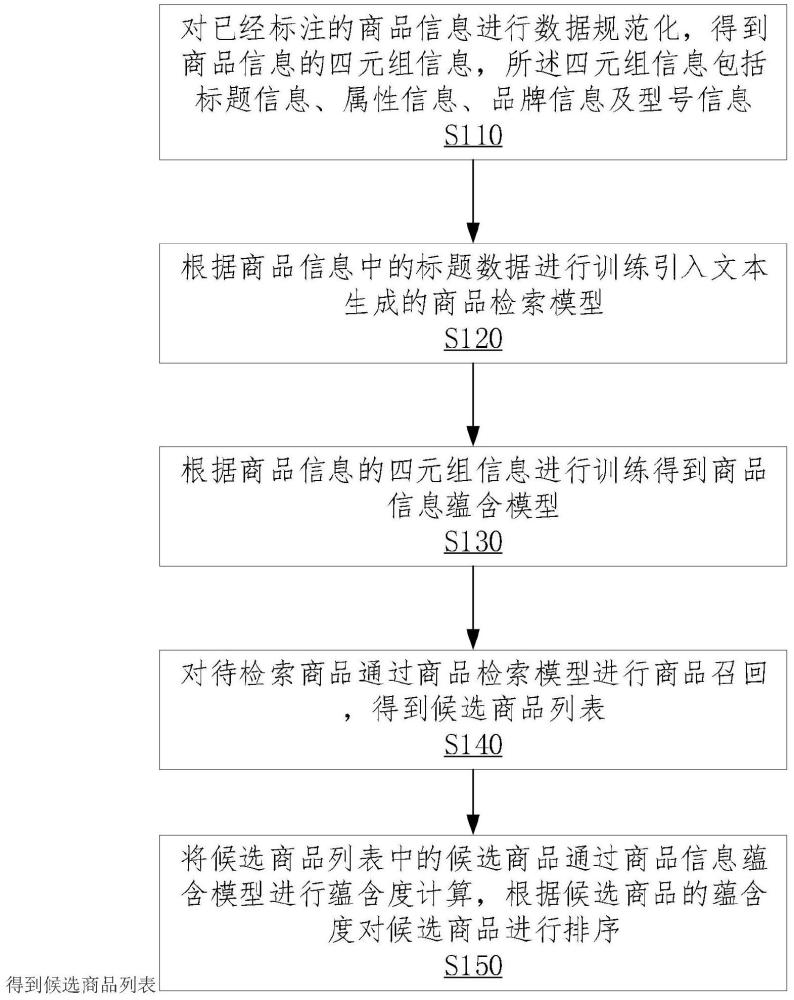 本发明涉及一种基于深度学习语义蕴含的商品检索方法及存储介质,包括以下步骤:对已经标注的商品信息进行数据规范化,得到商品信息的四元组信息;根据商品信息中的标题数据进行训练引入文本生成的商品检索模型;根据商品信息的四元组信息进行训练得到商品信息蕴含模型;对待检索商品通过商品检索模型进行商品召回,得到候选商品列表;将候选商品列表中的候选商品通过商品信息蕴含模型进行蕴含度计算,根据候选商品的蕴含度对候选商品进行排序。解决了双塔式模型缺少商品信息间交互的弊端,进一步提升了相似商品排序的精度,同时由于双塔式模型的召回,节省了大量的模型计算时间与设备成本。具有更好的鲁棒性、更快的速度以及更高的精度。
