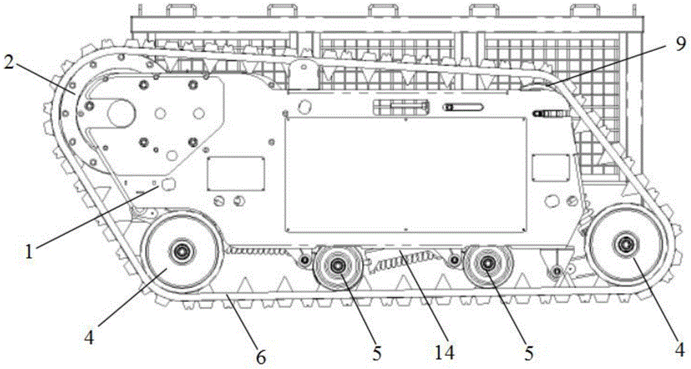 本实用新型公开了一种紧凑型履带行走装置及具有其的行走车,包括:支撑纵梁;驱动轮,驱动轮转动连接在支撑纵梁顶部的一侧;用于驱动驱动轮的驱动部,驱动部固定安装在支撑纵梁顶部,且靠近驱动轮设置,且驱动部与驱动轮传动连接;引导轮,引导轮为两个,两个引导轮分别设置在支撑纵梁底部的两侧;支重轮,支重轮设置在支撑纵梁底部且位于两个引导轮之间;以及行走履带,行走履带套于驱动轮、引导轮、支重轮上。本实用新型将驱动部设置在支撑纵梁上而不是车厢上,解决了传统履带行走车上车厢大部分空间用来放置动力部件、蓄电池等设备,没有足够的空间放置其他设备的弊端。