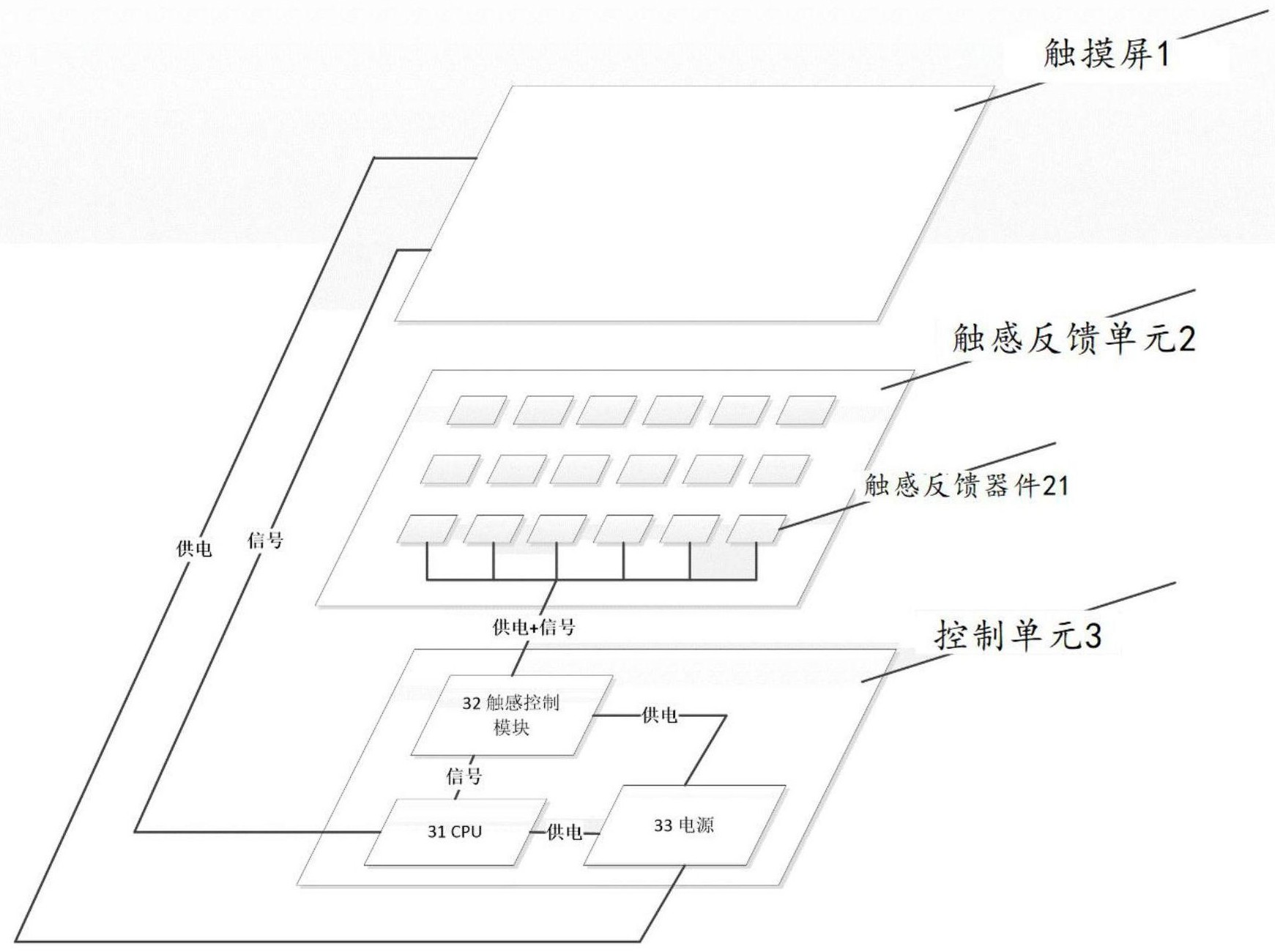 本发明提供了一种屏幕触感反馈系统及方法,系统包括:触摸屏;触感反馈单元,所述触感反馈单元包括多个触感反馈器件,位于所述触摸屏背侧;控制单元,分别与所述触摸屏、所述触感反馈单元电连接;当触摸屏被触碰时,所述触摸屏将触碰区域的触碰信息反馈至控制单元;所述控制单元接收到所述触碰信息后,控制所述触碰区域对应的触感反馈器件产生振动反馈。当用户触摸显示屏幕时,可以触发触摸区域的触感反馈器件产生局部振动反馈,为用户带来真实的按键触感。
