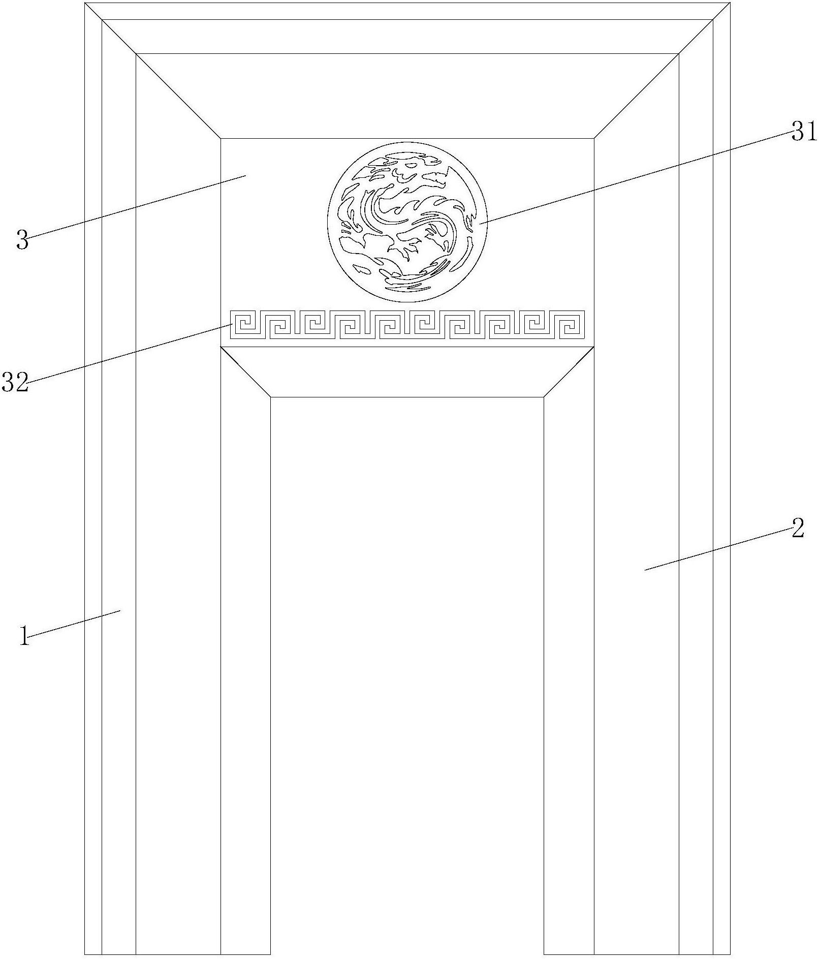 本实用新型公开了一种新型电梯专用套装门,包括第一门体、第二门体和门梁,所述第一门体和第二门体分别连接在门梁的两端,所述门梁的正对面设置有第一图案和第二图案,所述第一门体和第二门体均包括第一横板、第一倾斜板、第二倾斜板、第二横板和竖板,所述第一横板的一端连接有第一倾斜板,所述第一倾斜板远离第一横板的一端连接有第二倾斜板。本实用新型电梯专用套装门,通过将第一门体和第二门体设计成与电梯匹配的形状,使第一门体和第二门体包裹墙面上安装的电梯,安装方便,施工简单,该电梯专用套装门可以量尺定做,设计专业,适用一切电梯专用门,门梁正对面设置有第一图案和第二图案,设计专业,大气且独特。