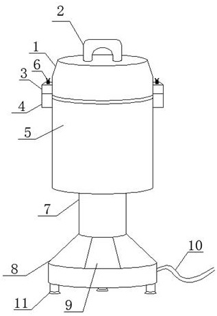 本实用新型公开了一种小型化妆品智能磨粉机,其结构包括顶盖、把手、上连接块、下连接块、粉碎筒、固定螺栓、电动机、底座、控制开关、电源线、减震杆、主轴、第二叶片、中央处理器、变压器、第一叶片、滤网和蓝牙模块,本实用新型的一种小型化妆品智能磨粉机,通过设置蓝牙模块于底座内,并且与智能手机进行无线连接,智能手机上即可远程对磨粉机内设备进行控制,实现了远程智能操作,解决了现有技术智能性差,智能手机控制功能差的问题,再设置了第一叶片于主轴内上端,主轴中部设置有滤网,对物料先进行预破碎,再由第二叶片进行磨粉,提高了工作效率,减少叶片的损伤,解决了磨粉效率低的问题。