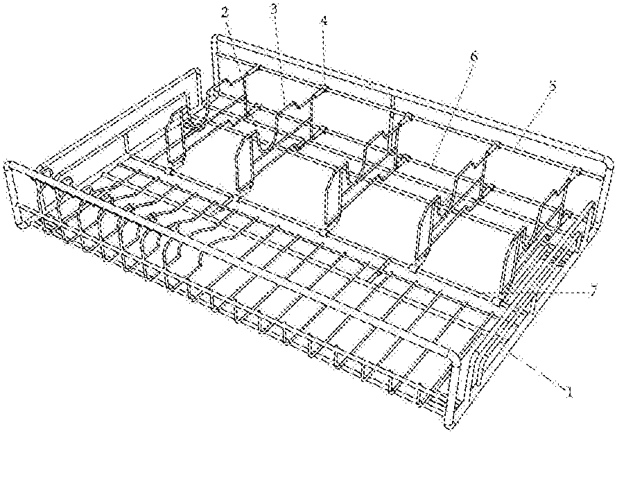 本实用新型公开了一种可放锅的篮子,包括拉篮本体和锅具置物档条,锅具置物档条置于拉篮本体内,锅具置物档条包括有锅具档条主体和若干塑料连接件;所述塑料件固定于档条主体上,在塑料连接件对应的拉篮本体上固定有第一固定筋、第二固定筋和第三固定筋,并且塑料连接件卡设在相应的第一固定筋、第二固定筋和第三固定筋上。本实用新型的拉篮内设有锅具置物档条,并且通过塑料连接件进行位置调节,能够调节相互之间的距离,便有不同体积的锅具放置;也可以将锅具置物档条水平固定,为拉篮内提供更多可放置厨具的位置,使用灵活多变,适应家庭内部不同体积大小的厨具,使内部放置更加整齐,便于取用。