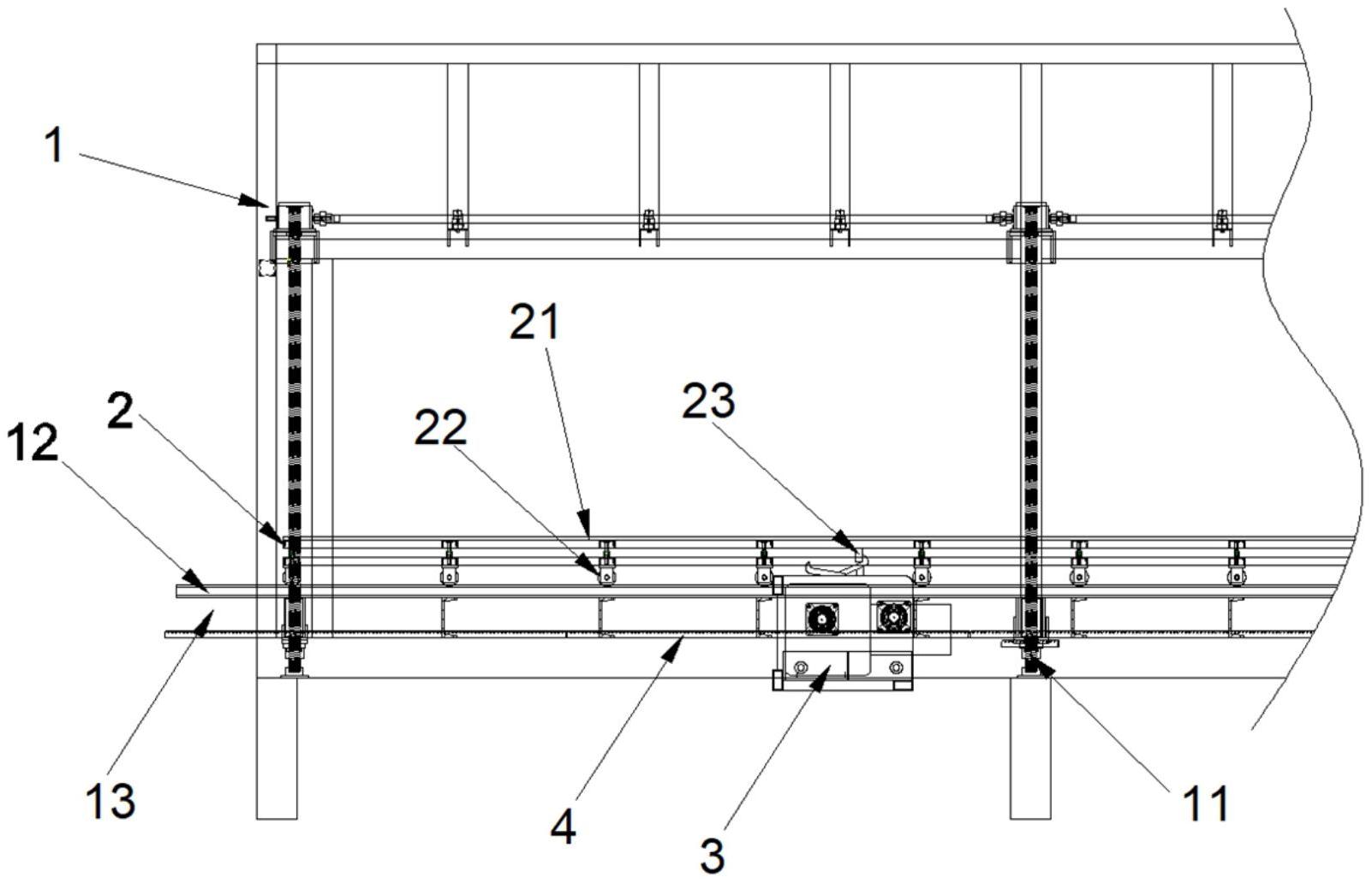 本实用新型公开了一种新型直冷块冰机推冰装置,包括块冰机框架、制冰冰床、推冰小车和齿条,所述块冰机框架用于安装制冰装置,所述齿条与块冰机框架连接,所述推冰小车与齿条连接,所述推冰小车与制冰冰床连接,所述推冰小车包括卡勾、固定轴、推杆、齿轮、驱动装置和限位装置。通过齿条与齿轮的配合,使推冰小车可以在齿条上前进和后退,推冰小车将制冰冰床沿着预定轨道推出制冰设备,实现了推冰小车不与冰块接触,不会对冰块造成损害,推冰完成后可以控制推冰小车退回到初始位置,本推冰装置使用安装简单,运行可靠,节约经济成本。