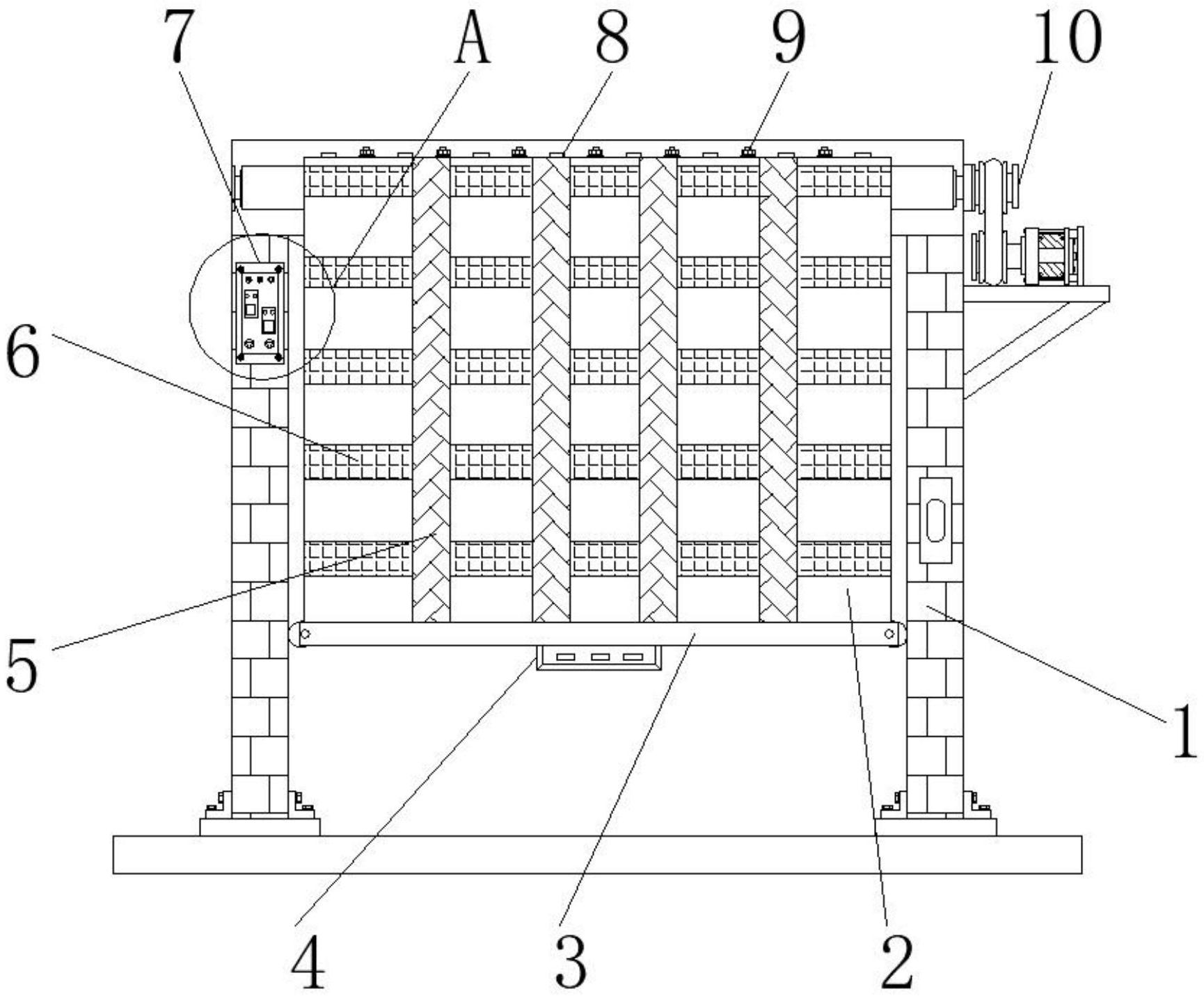 本实用新型公开了防火耐用的快速自动堆积门,包括支撑墙、门体、挂杆、红外传感器和第一加强筋,所述支撑墙一侧的外壁上安装有门体,所述门体底端的一侧安装有挂杆,所述挂杆底端的一侧安装有红外传感器,所述门体表面的一侧安装有第一加强筋,所述门体表面远离第一加强筋的一侧安装有第二加强筋。本实用新型通过驱动电机转动带动主动轮转动,主动轮转动带动传动带转动,传动带转动带动从动轮转动,从而带动收卷筒转动,收卷筒转动带动门体开始转动,从而将门体散开,门体开始下移,带动挂杆往下移动,挂杆两侧的滑轮顺着支撑墙的外侧壁下滑,可以确保门体下落的稳固性,实现了该装置便于快速稳固上升的功能。